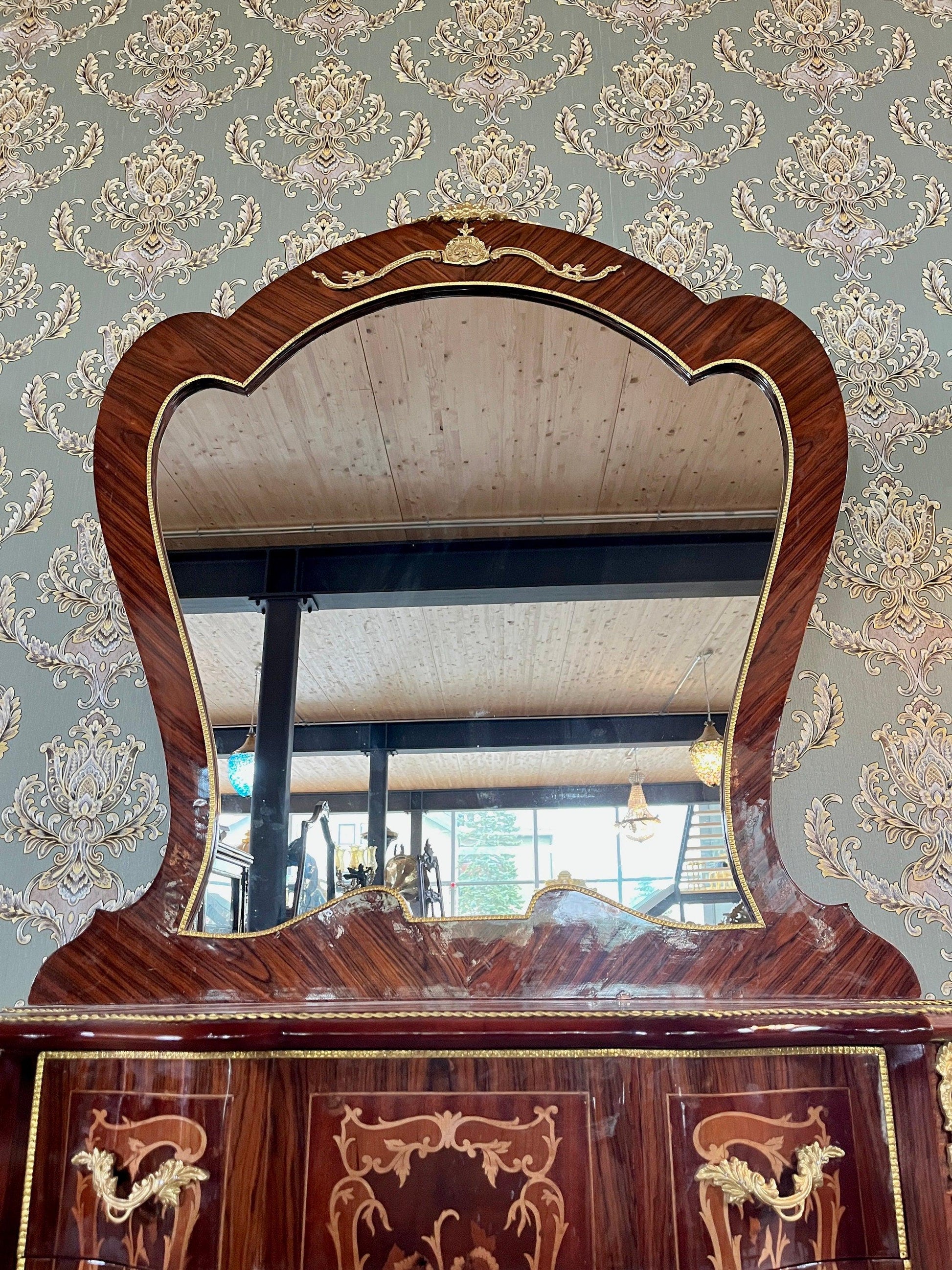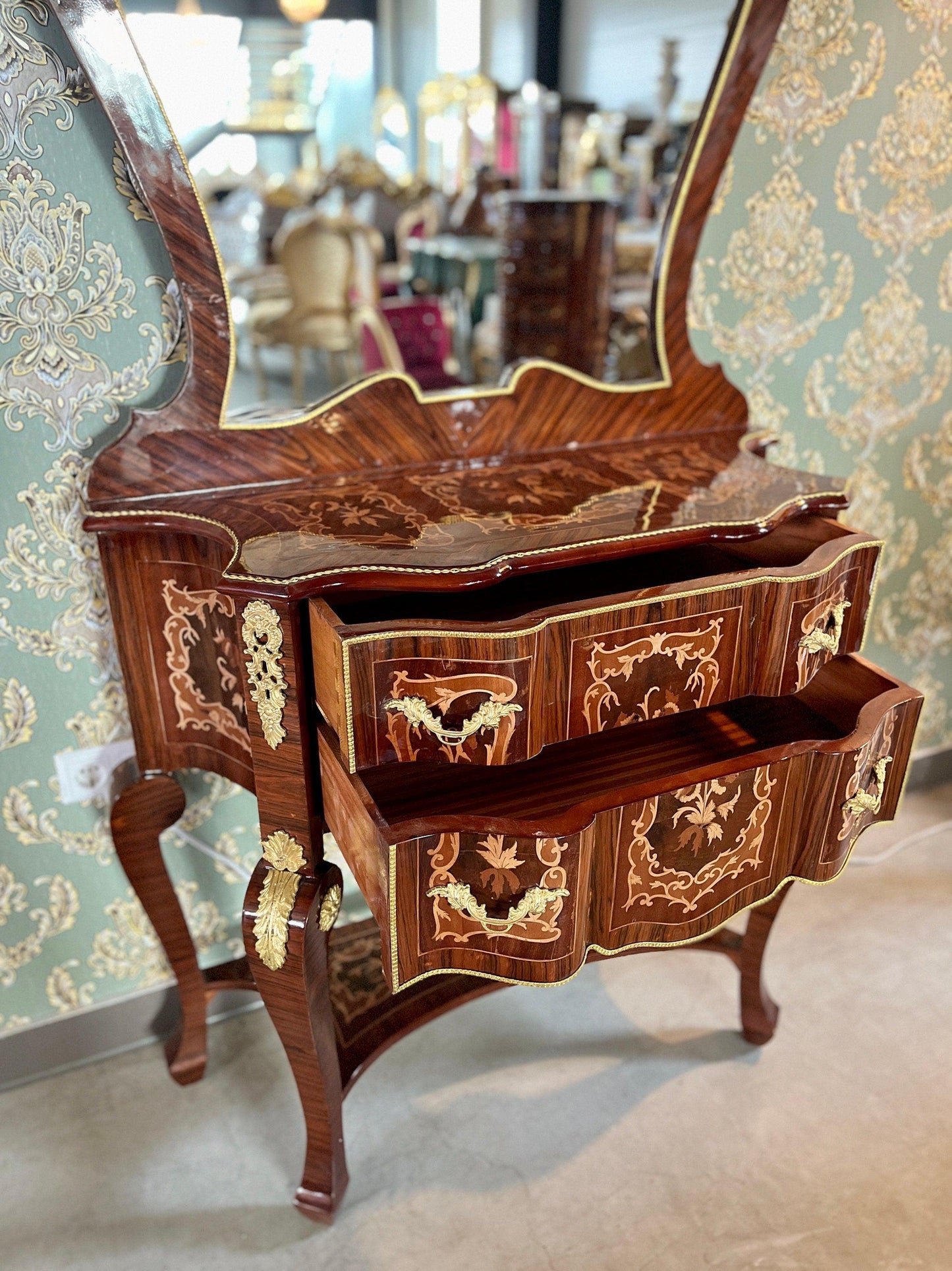 A wooden mirror table with drawer console in retro baroque antique style reproduction.