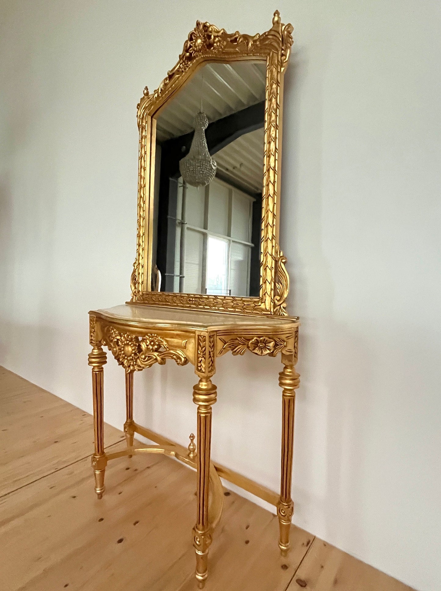 Mirror Table Console Retro Baroque Style with Marble Slab Top Handmade Wooden Table in Gold Finish