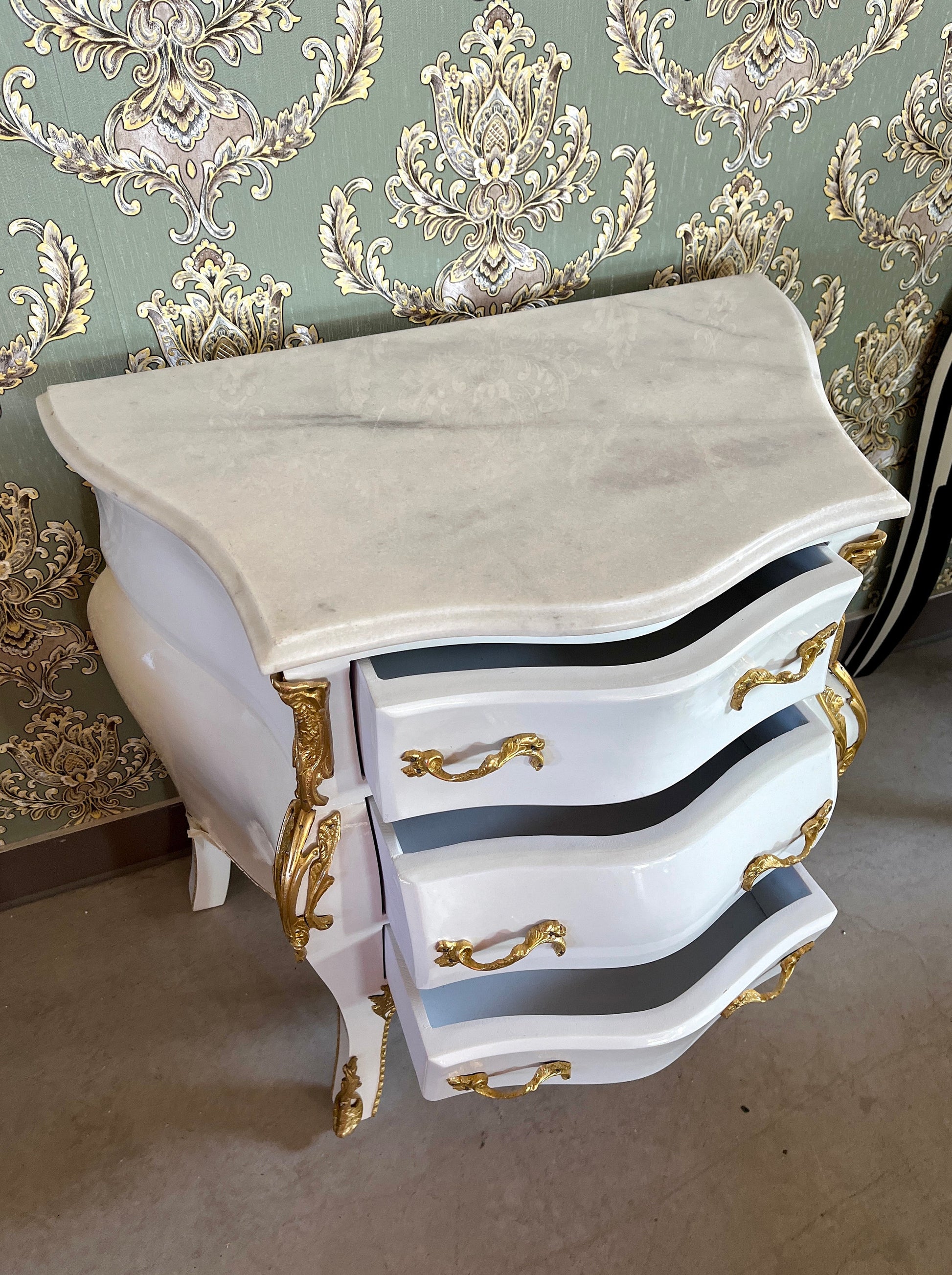 Handcrafted in solid wood painted in white color and a white matching marble slab at top. Each piece is unique made. It fits well in a bedroom or in business occasion.