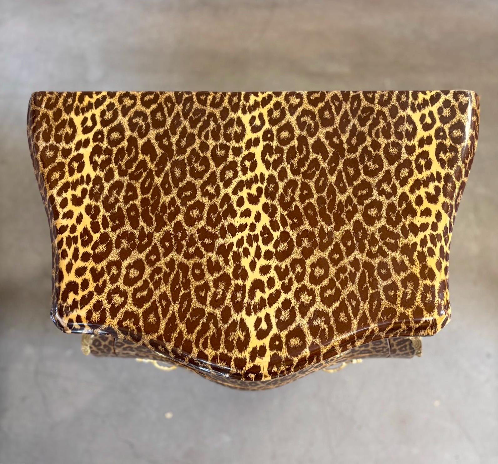 Retro baroque style wooden night stand in leopard pattern. This style is from French Louis XVI reproduction with bronze handles and two drawers.