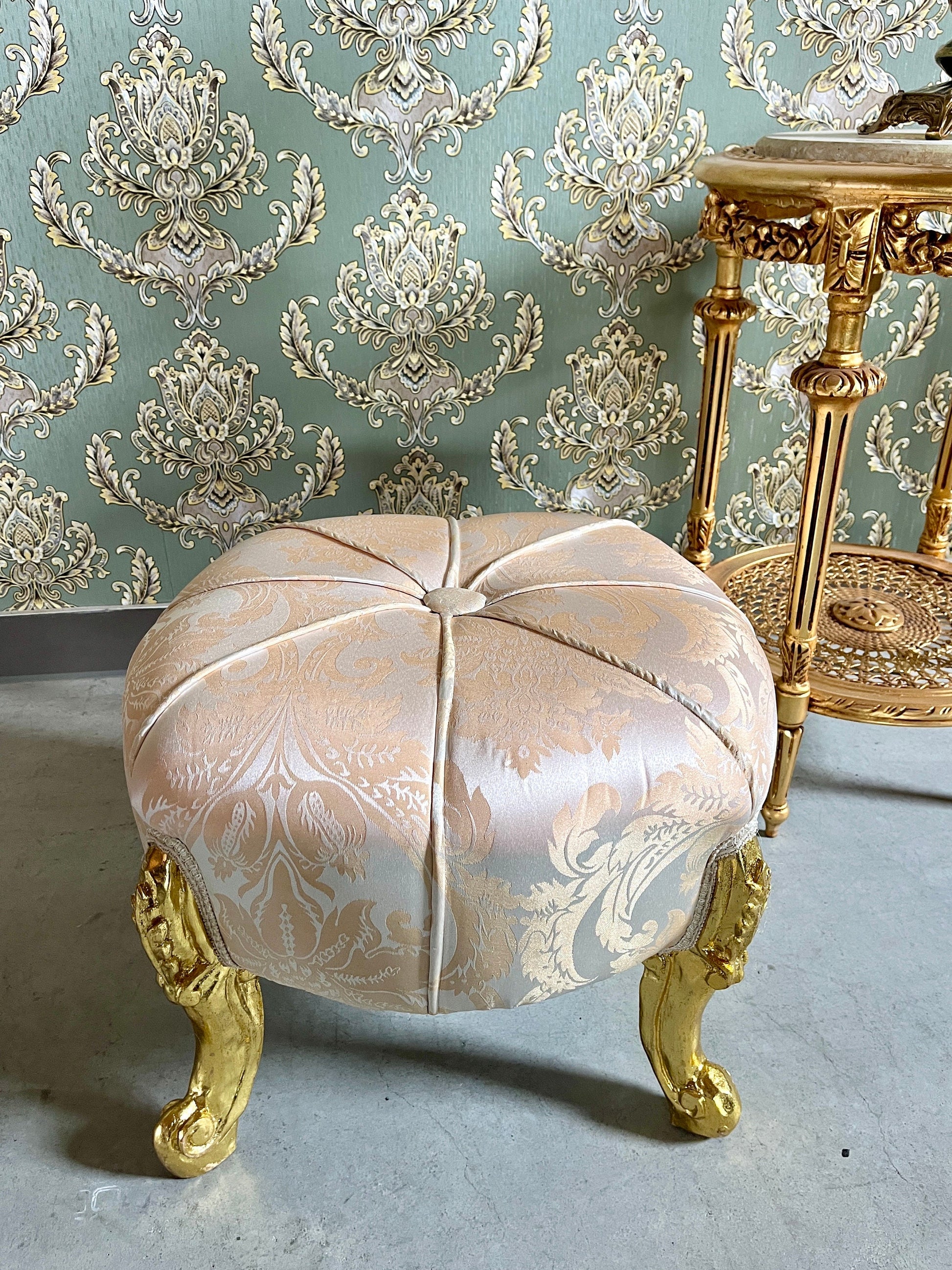 Ottoman French Baroque Rococo Style Footstool for Home Decor Foil Gold Finish in Gold / Beige / Black Jacquard Fabrics