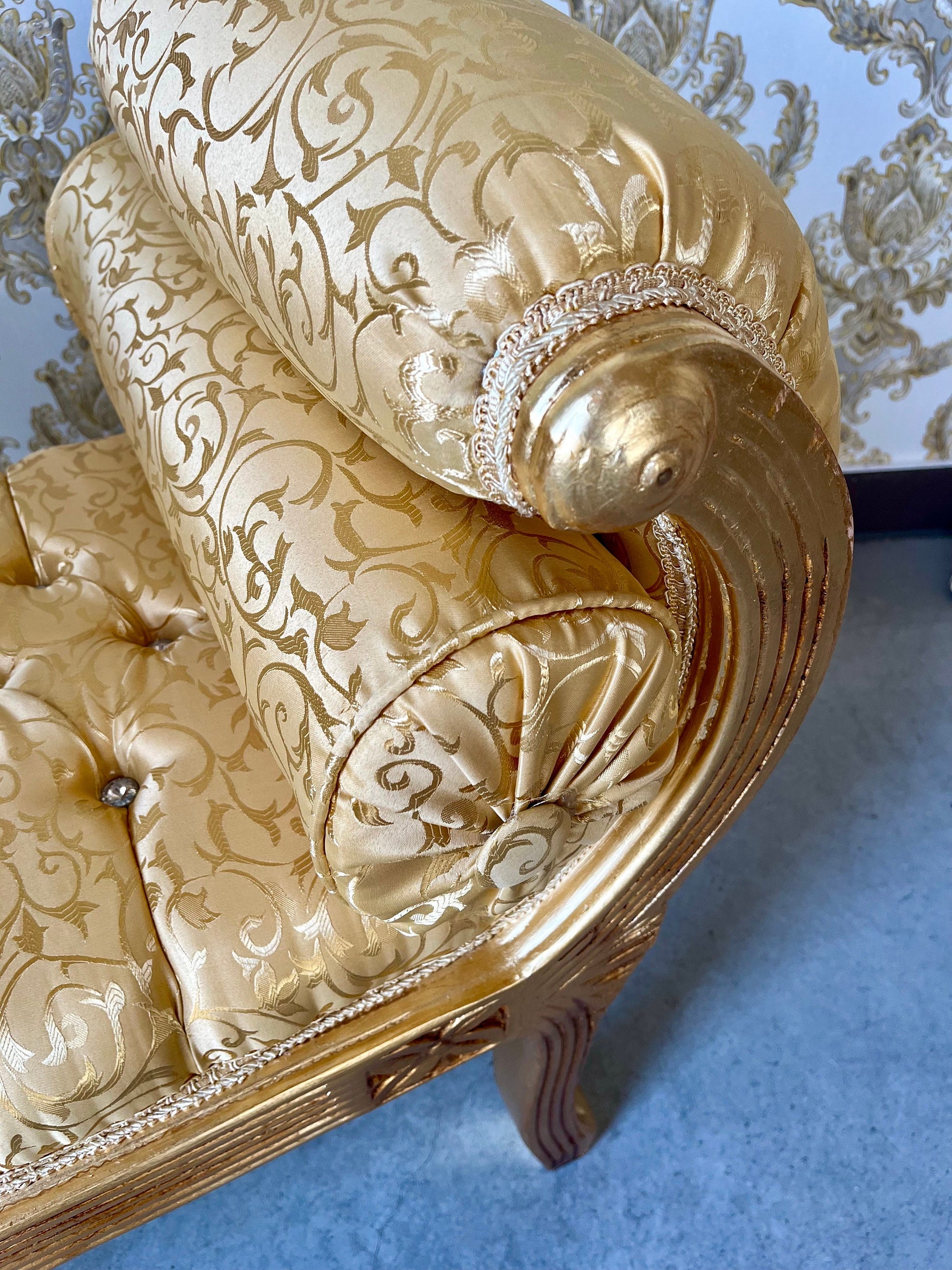 Upholstered with polyester jacquard fabric, handcrafted in solid beech wood, gilded in gold foil leaf and crystal decoration. It’s sturdy, cozy and stylish !