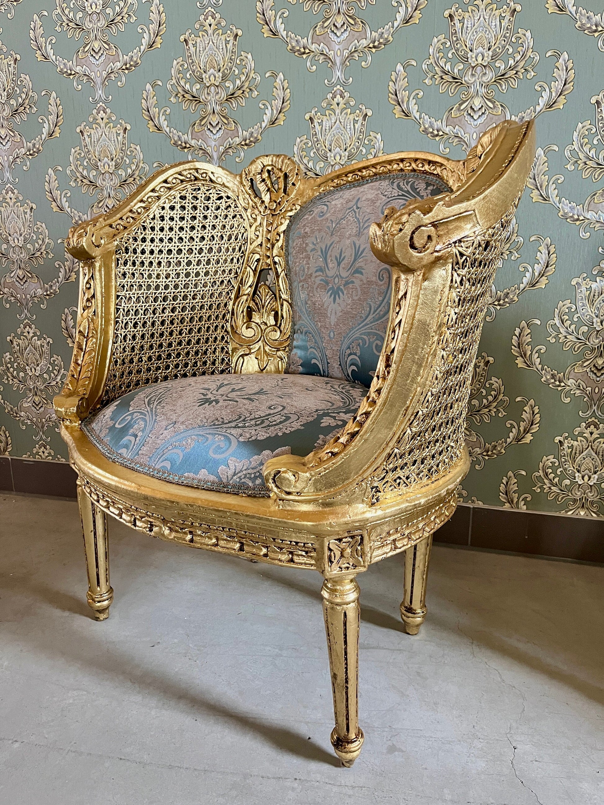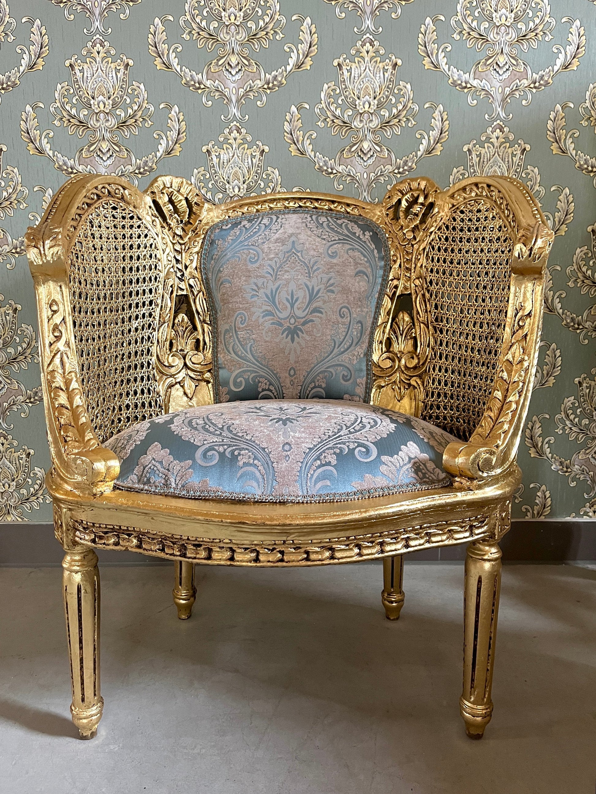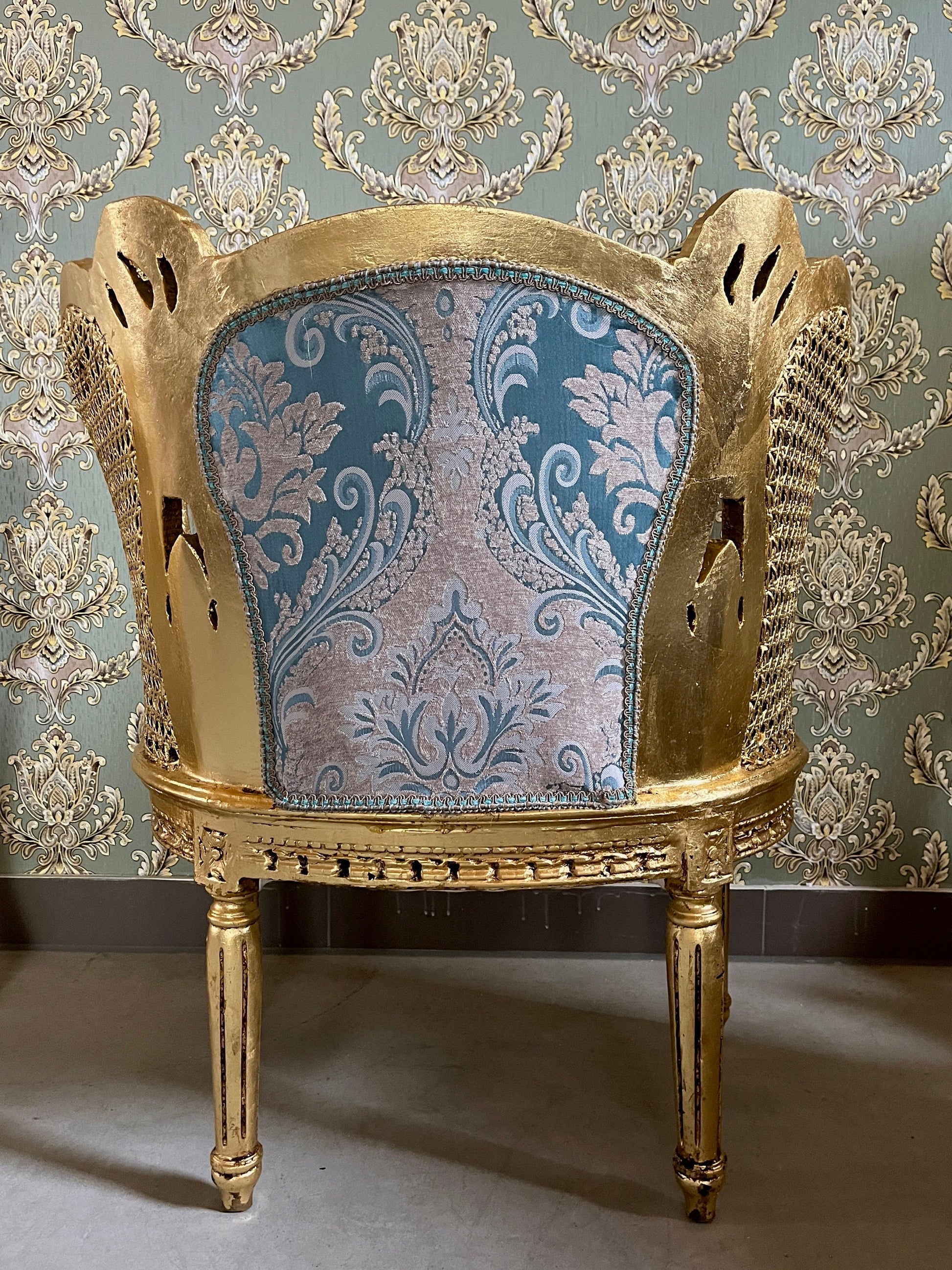 Upholstered in polyester jacquard velvet in blue, woven mesh shape arms, handcrafted in solid beech wood and gilded with foil gold leaf. It would definitely shine at lobby.