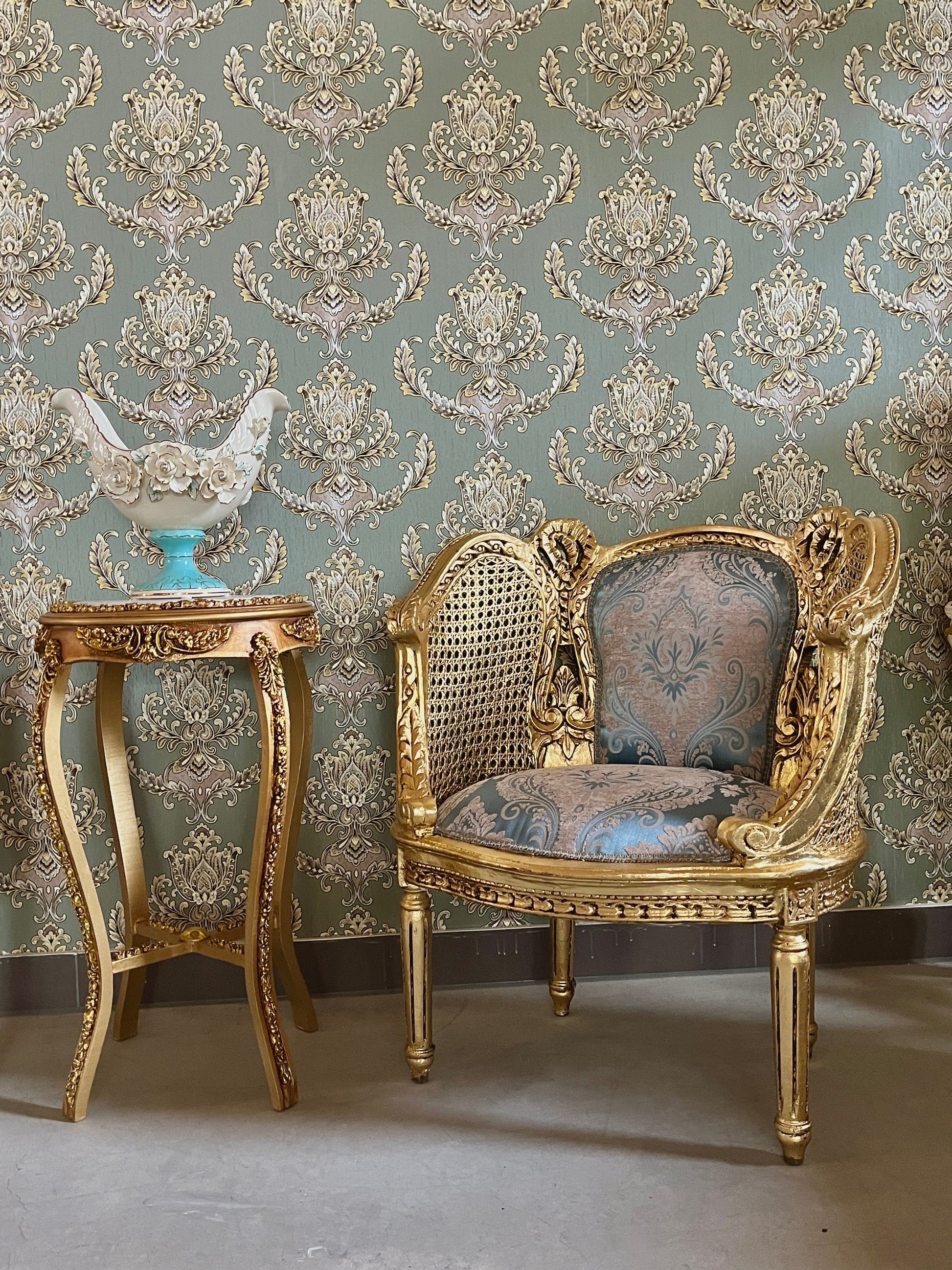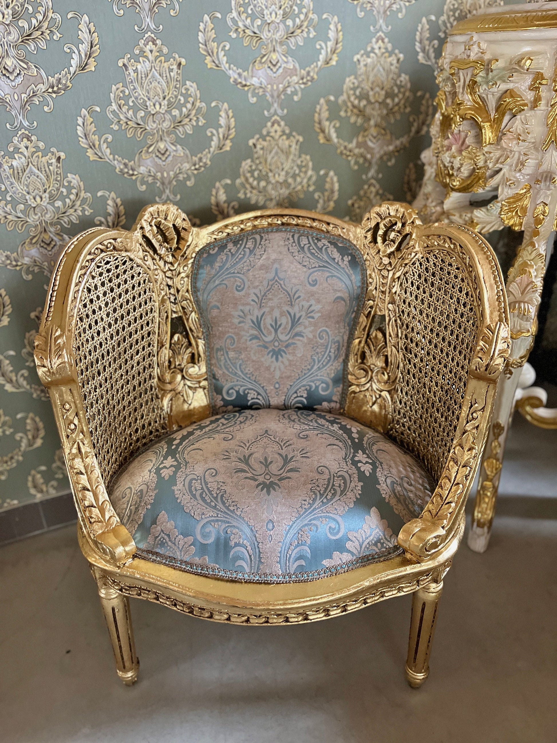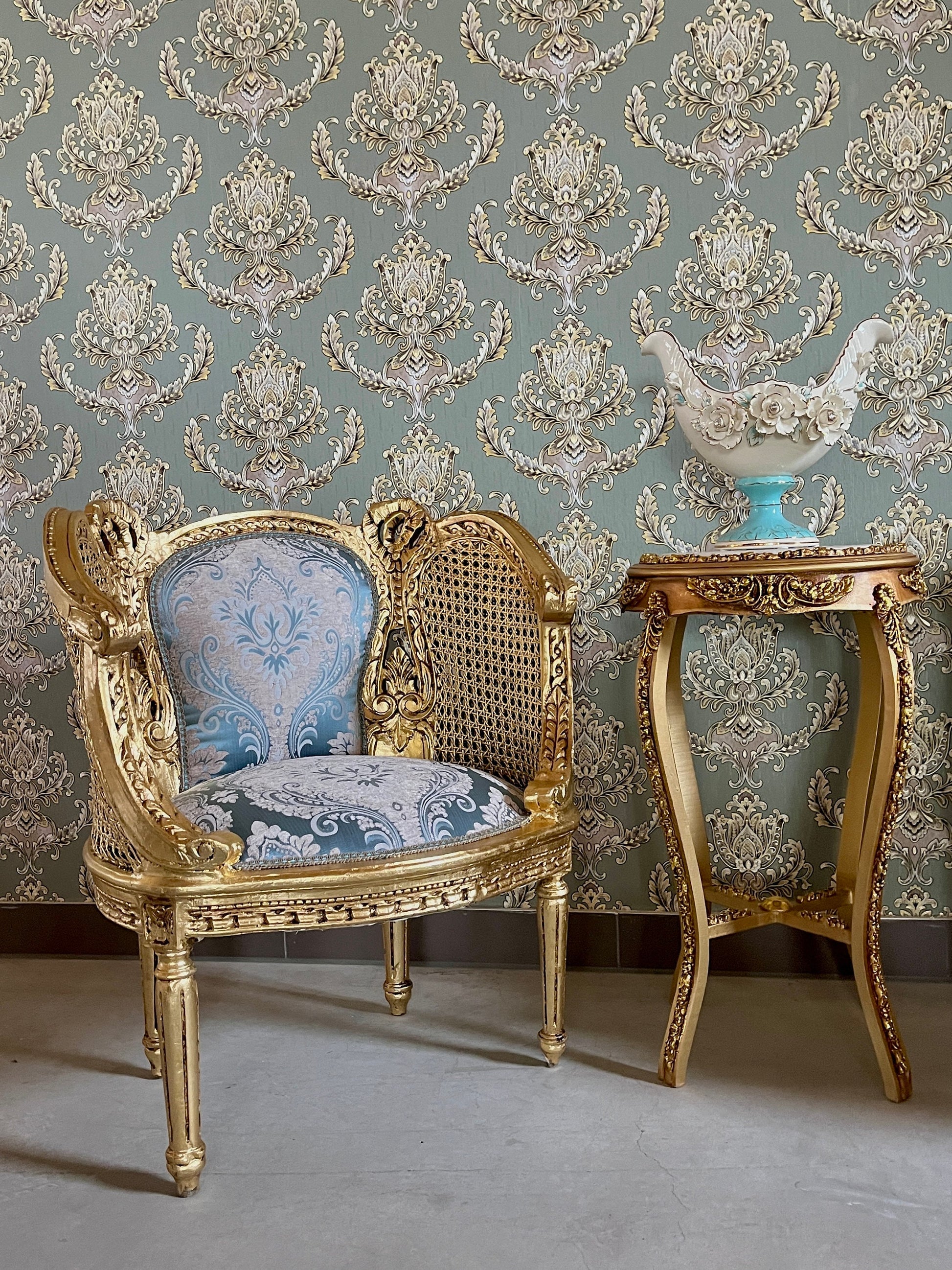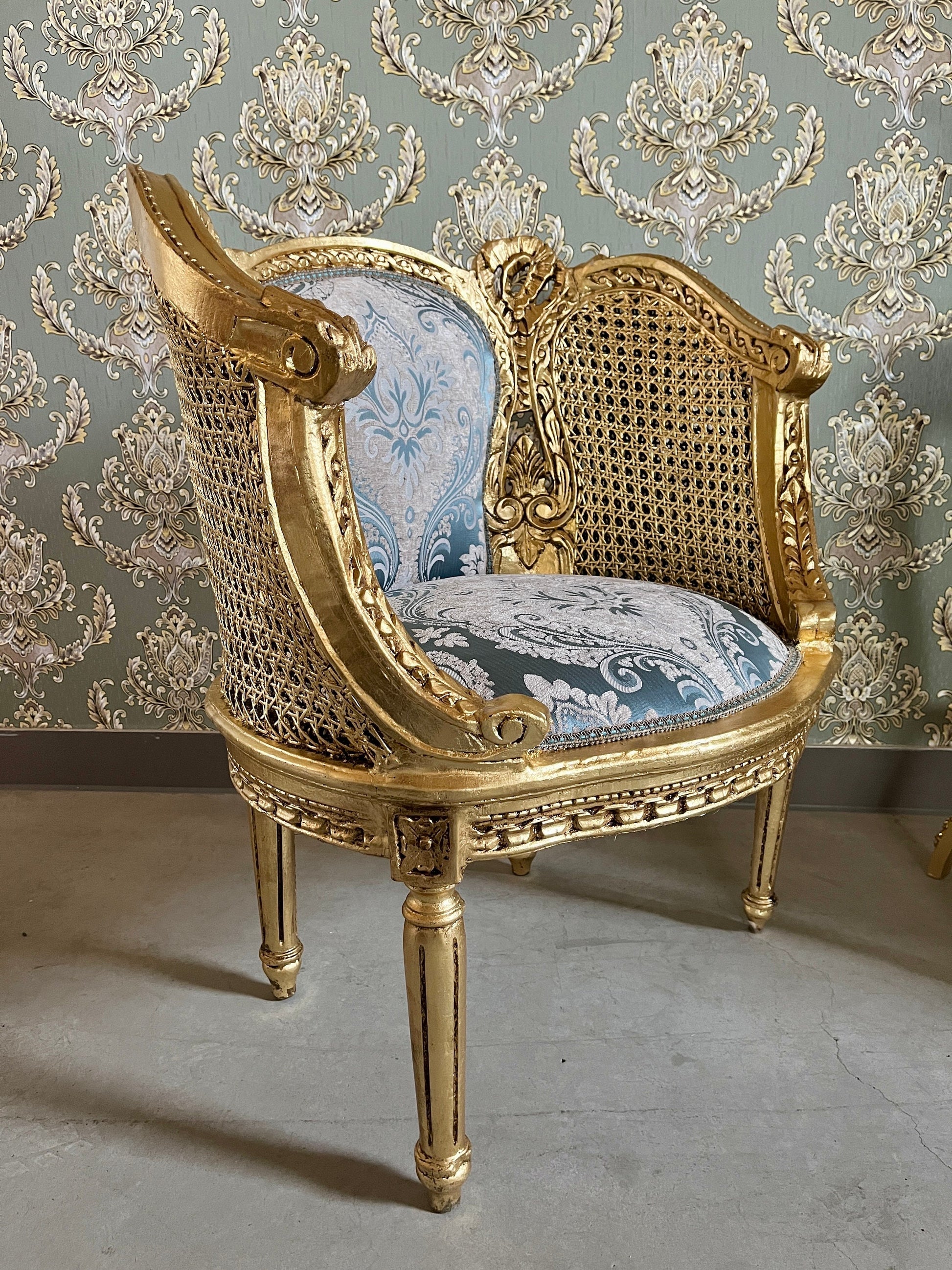 Upholstered in polyester jacquard velvet in blue, woven mesh shape arms, handcrafted in solid beech wood and gilded with foil gold leaf. It would definitely shine at lobby.