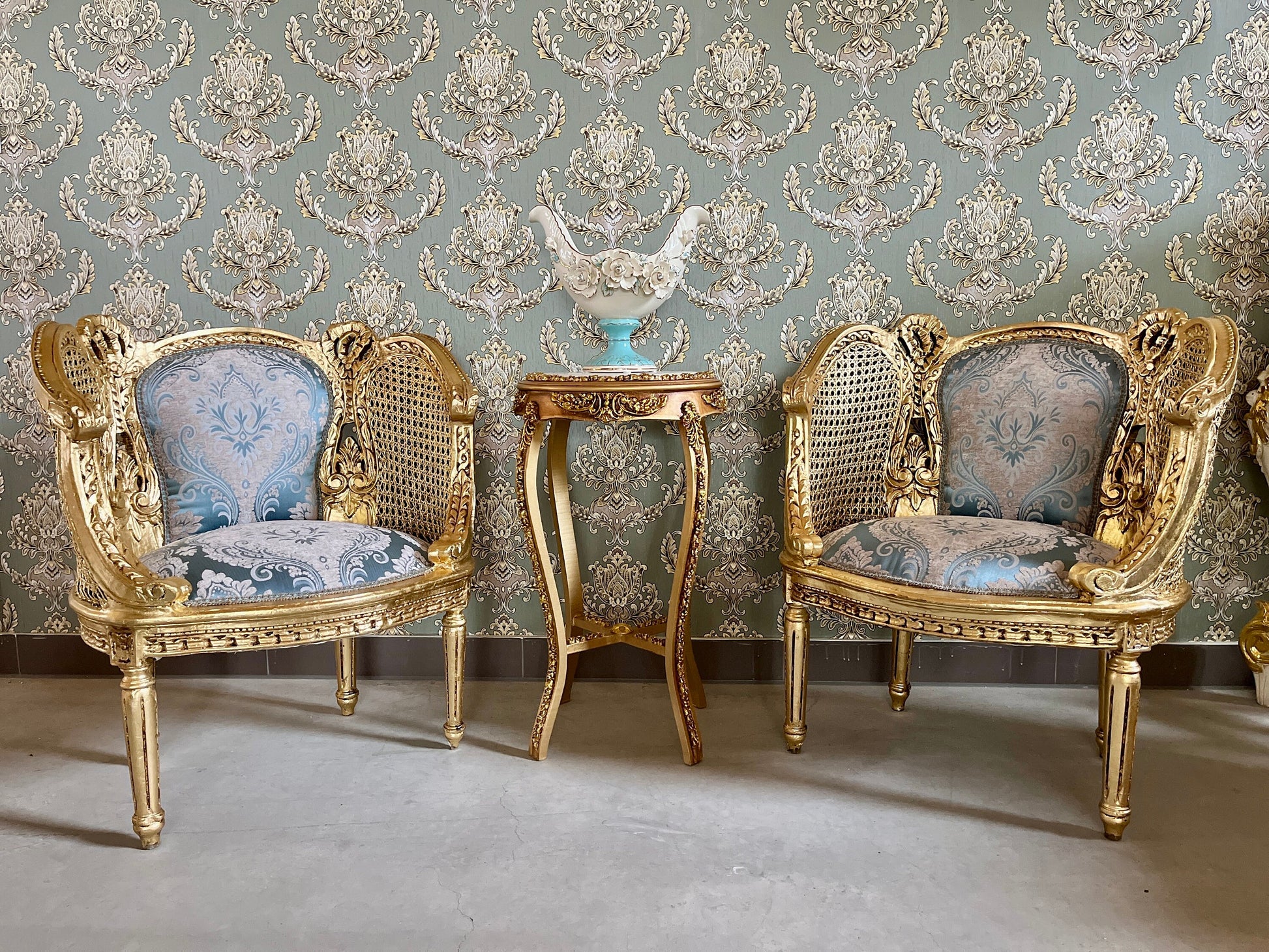Pair Set Armchair Blue Royal Baroque Rococo Antique Style Chair in Gold Finish Woven Mesh Armrest & Blue Velvet Fabric for Lounge Room Decor