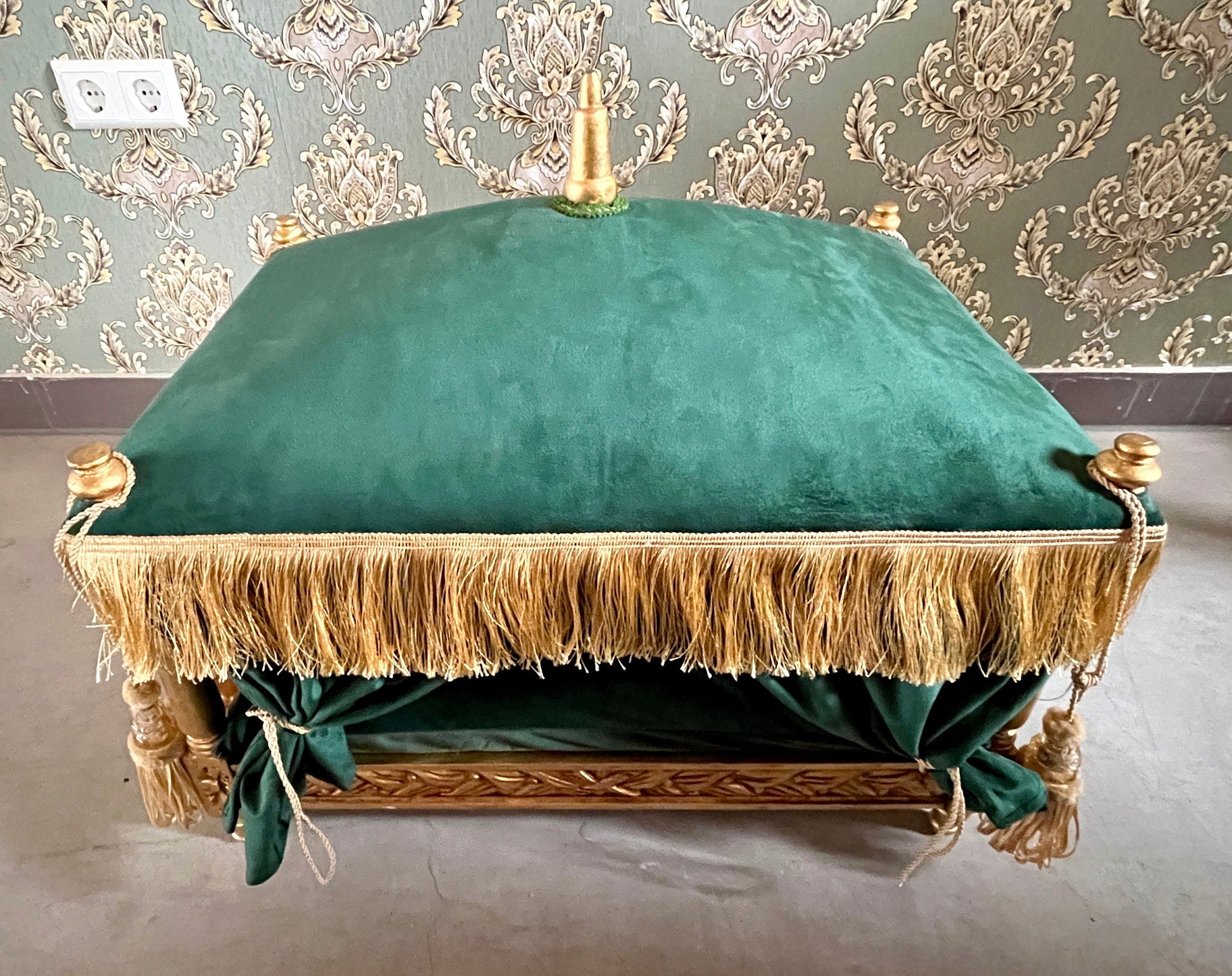 Handcrafted in solid beech wood, upholstered with velvet fabric and gilded with foil gold leaf. The roof cover is detachable. It’s cute and pets love it !
