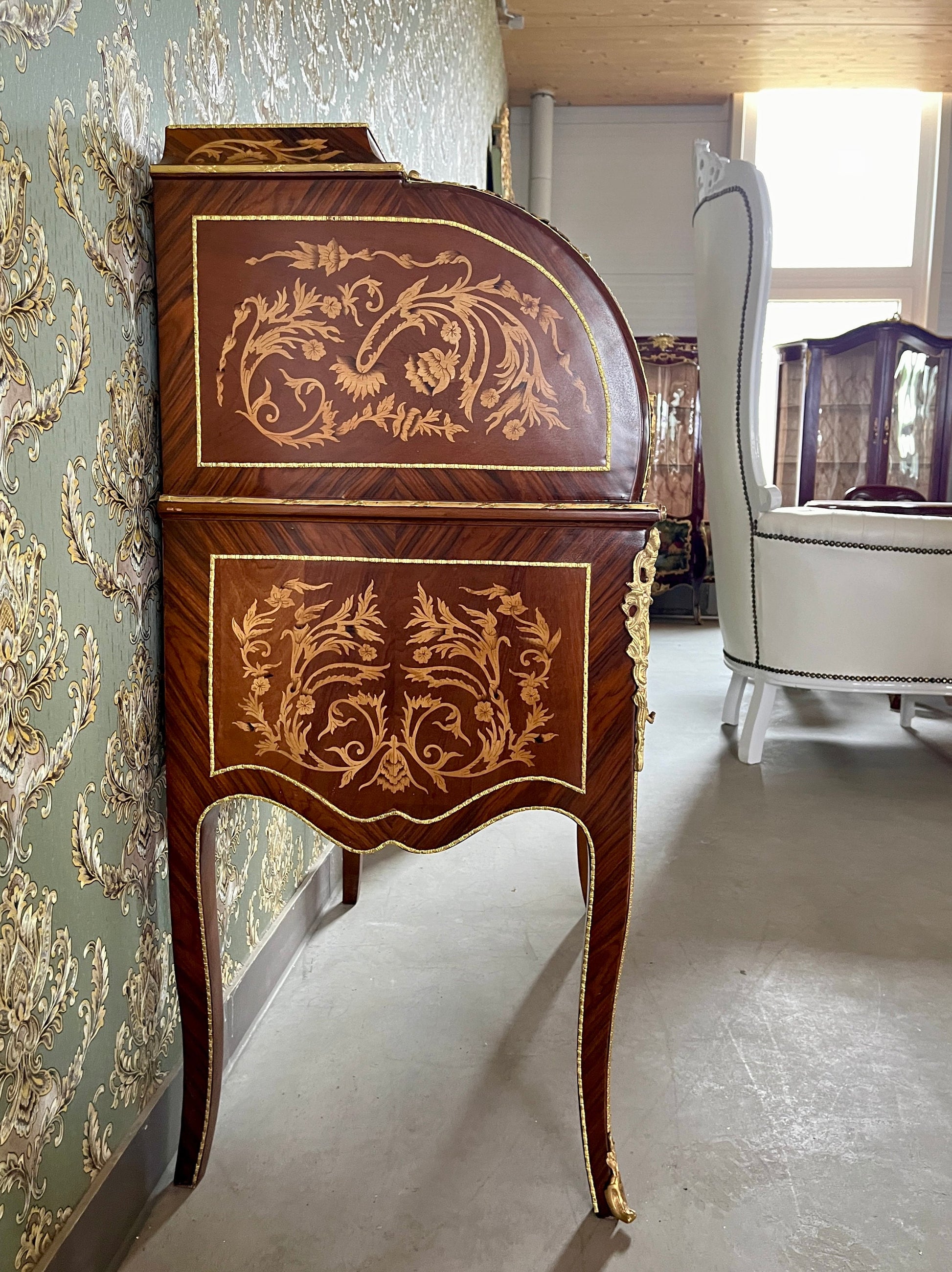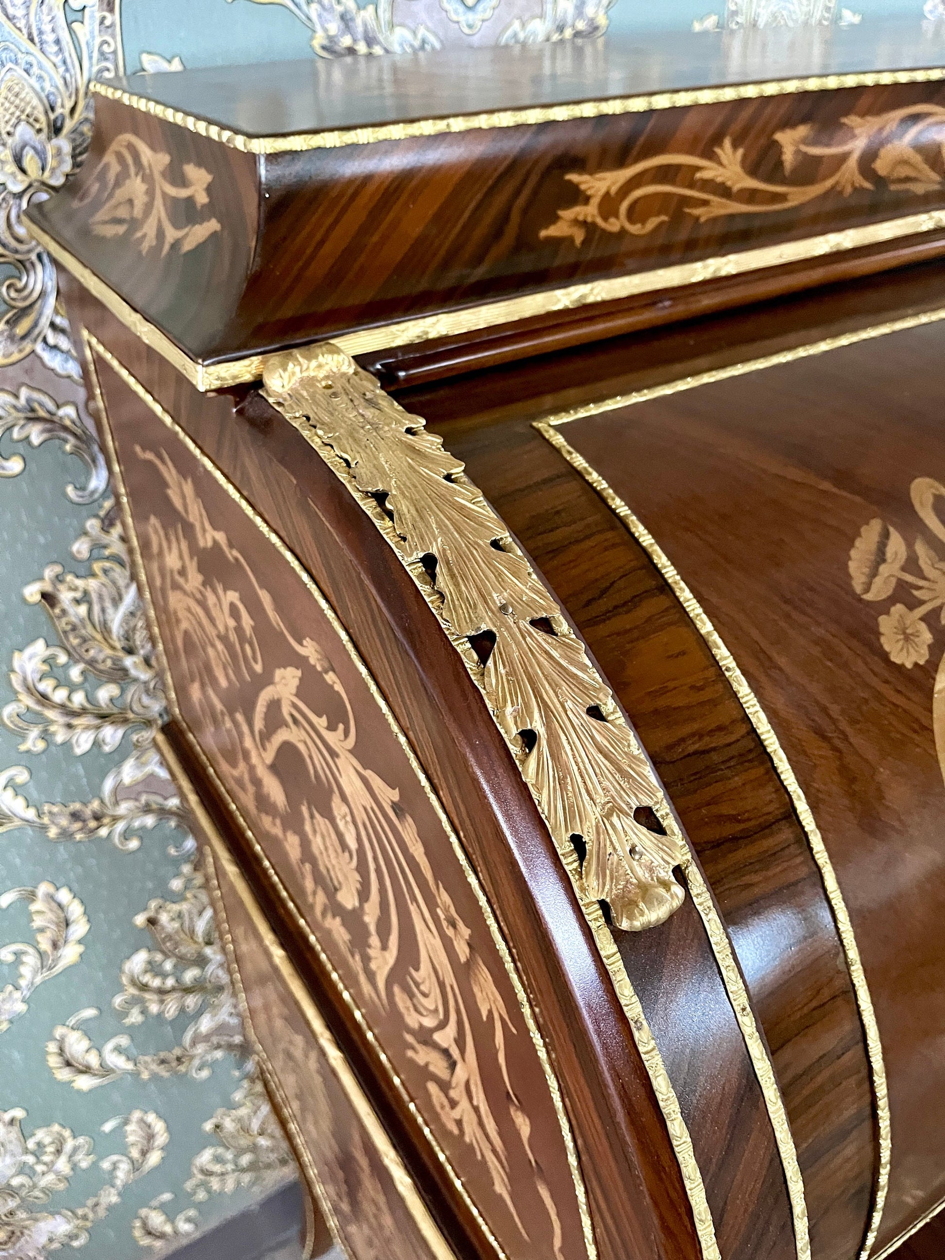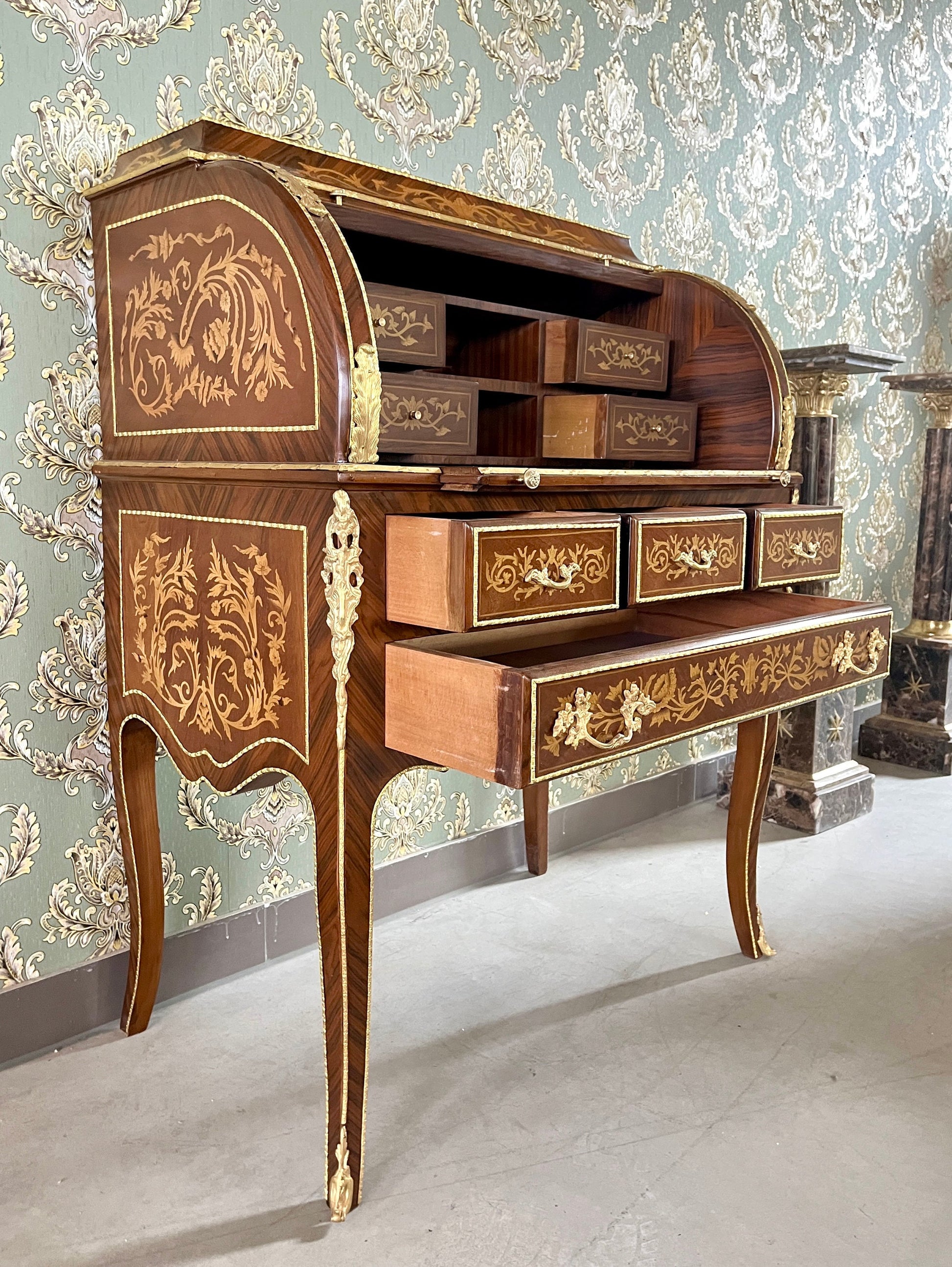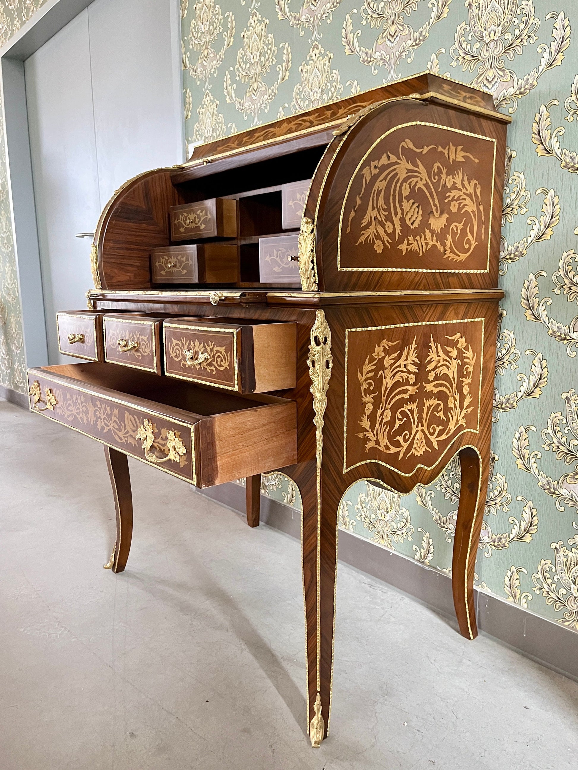 The desk feature solid craftsmanship, bronze ornate details, delicate wooden patterns and plenty of storage space.
