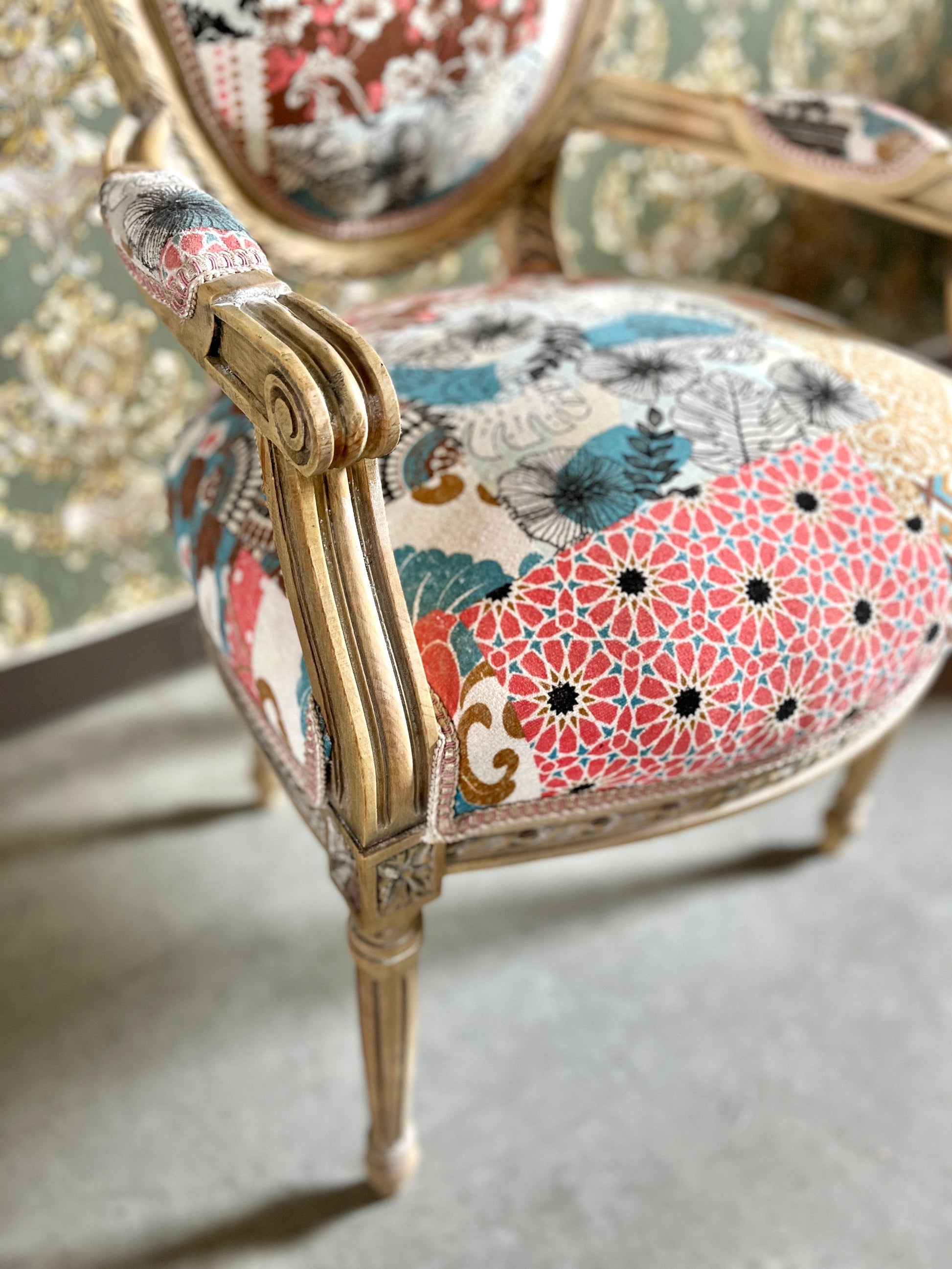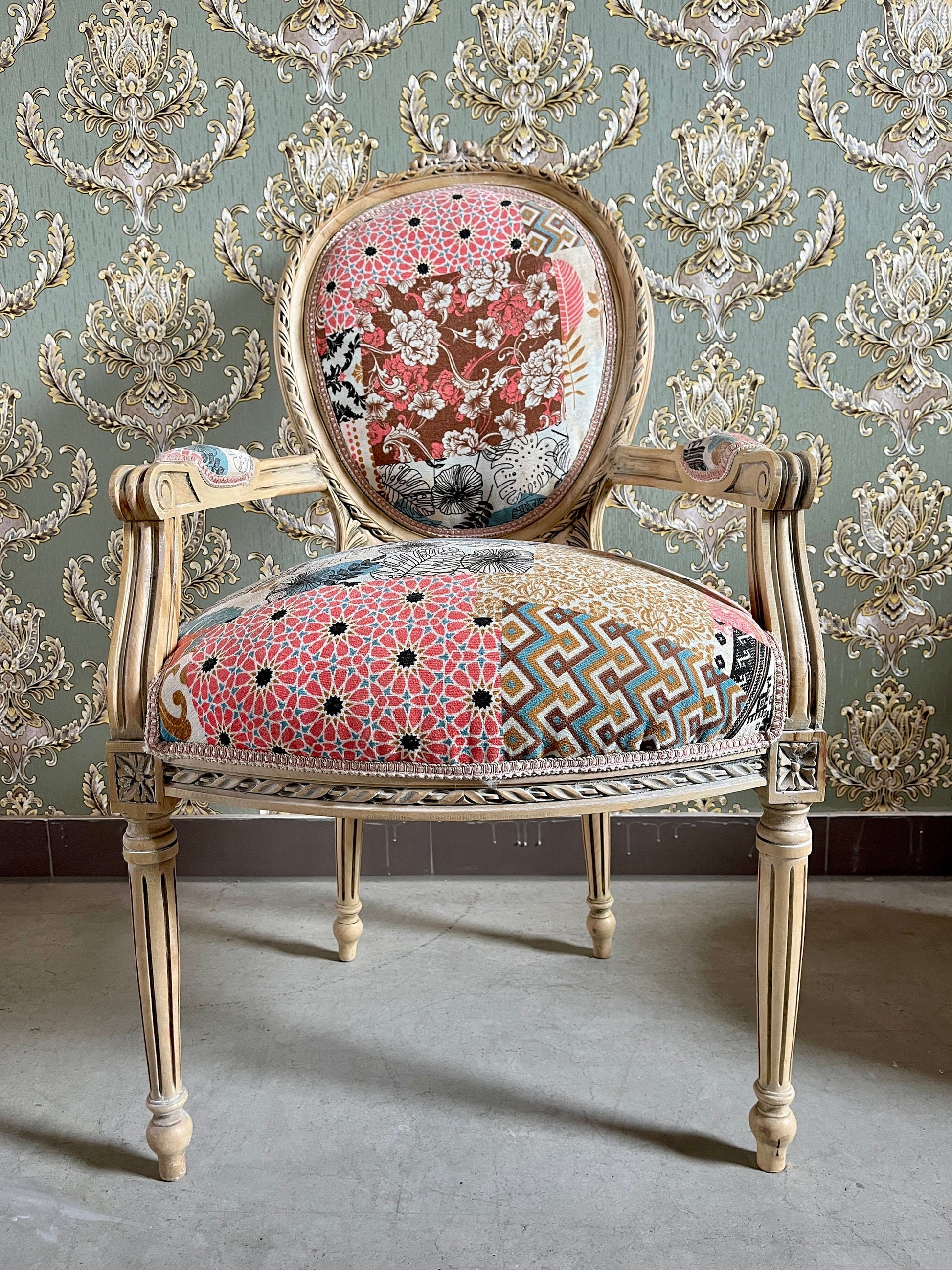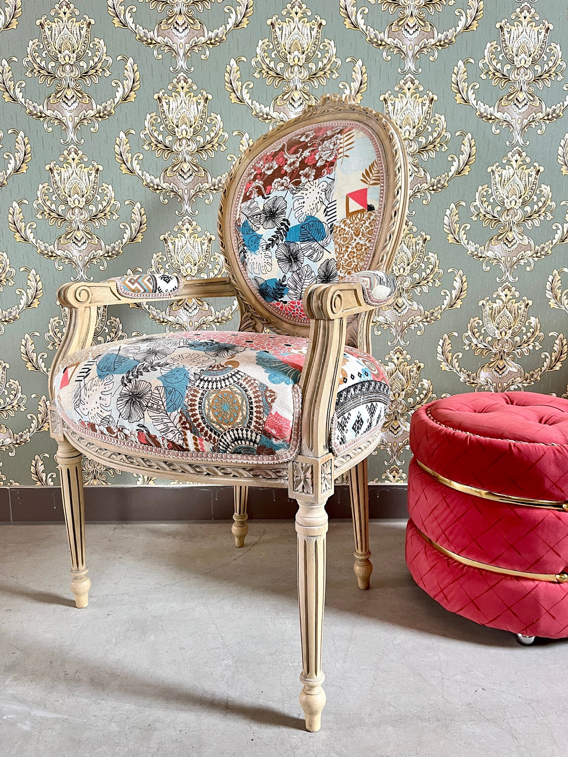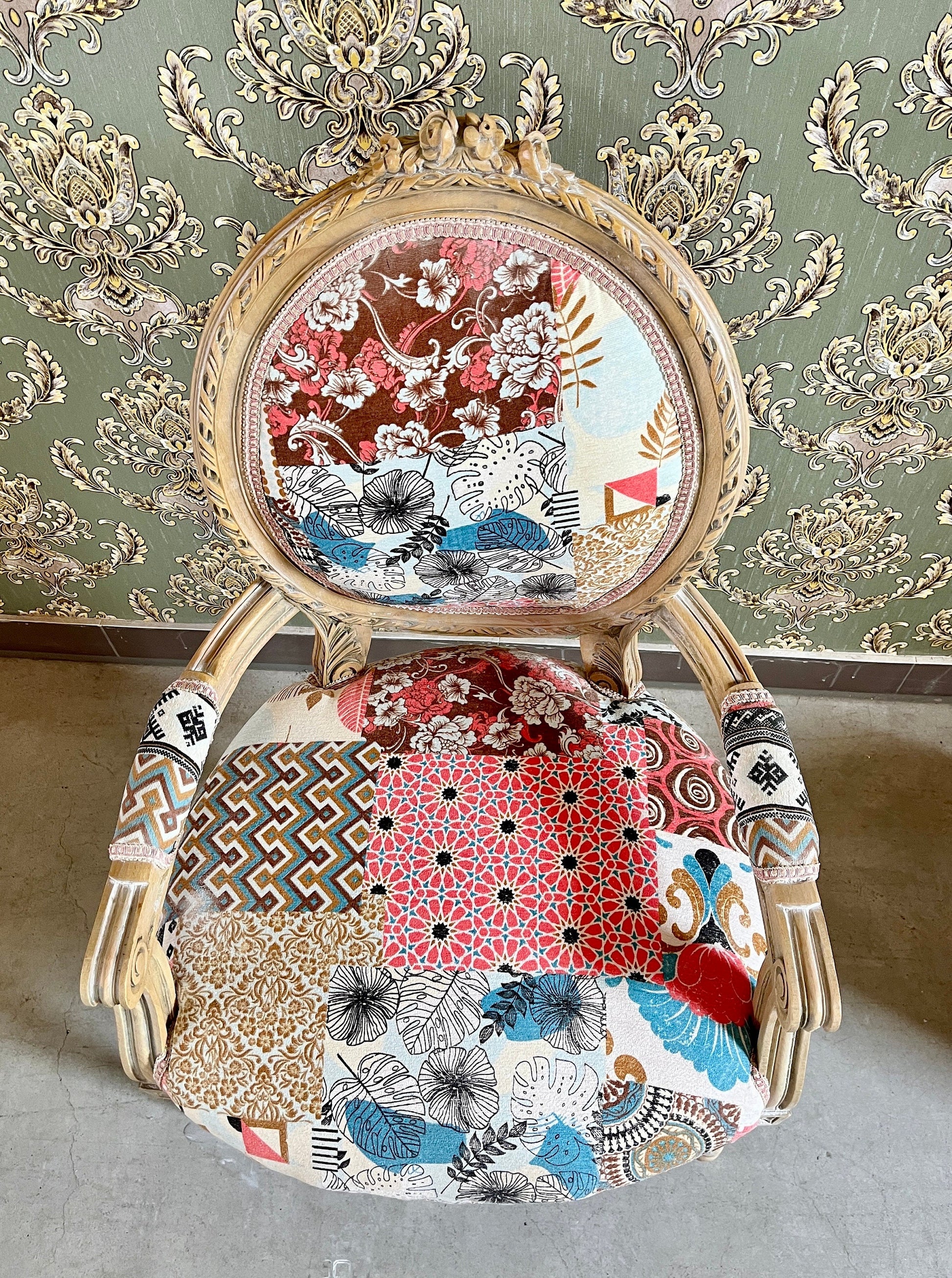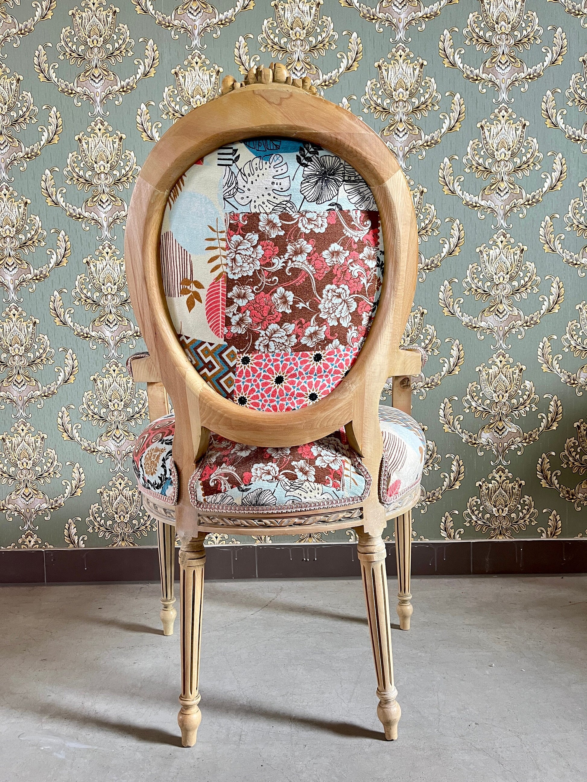 The chair is made of solid beech wood and upholstered with cotton blended fabric in colorful flowers print, finished treatment in vintage touch.