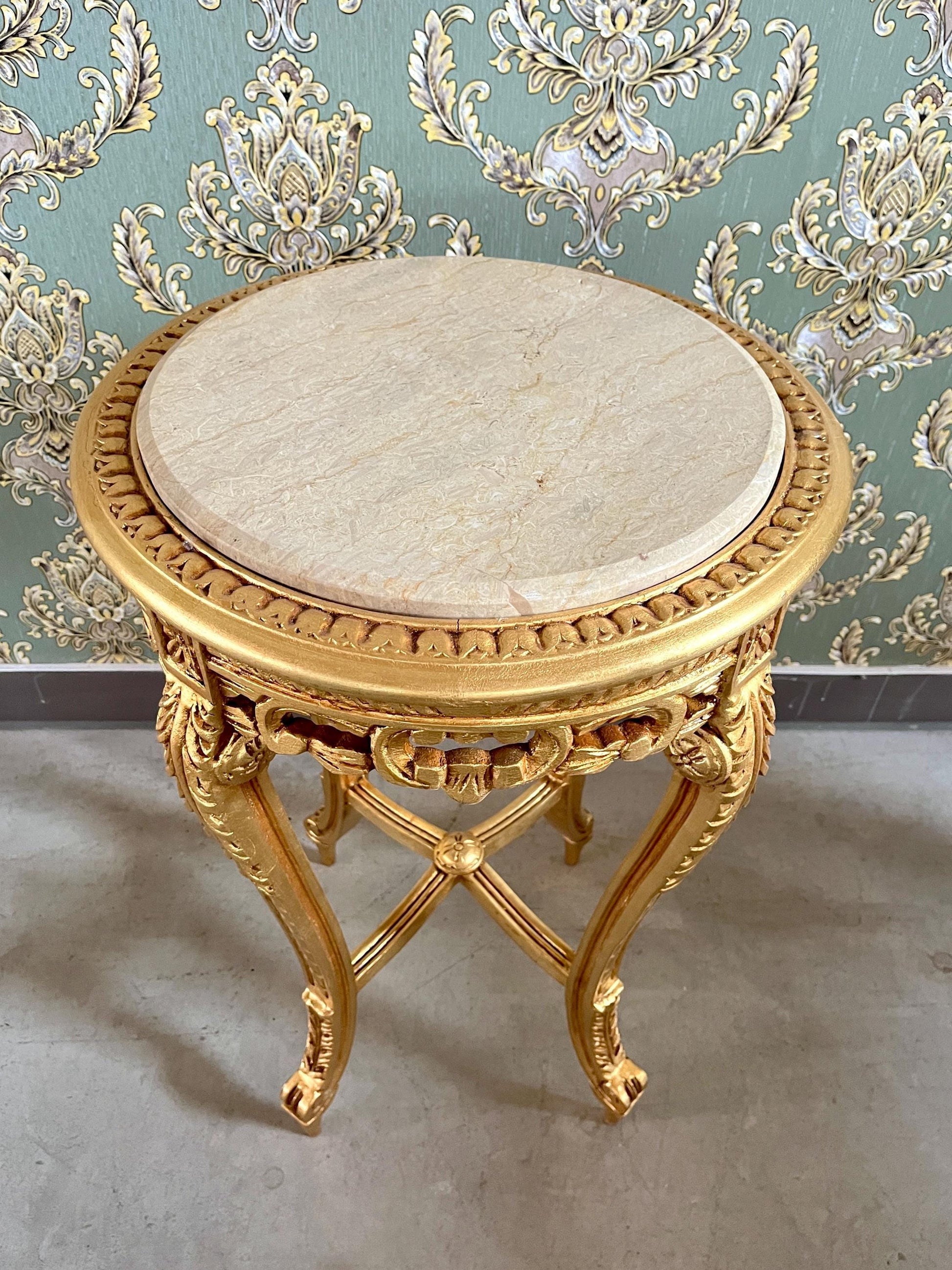 This round wooden side table in retro baroque style is an eye catcher. The marble top gives it a touch of elegance and sophistication.