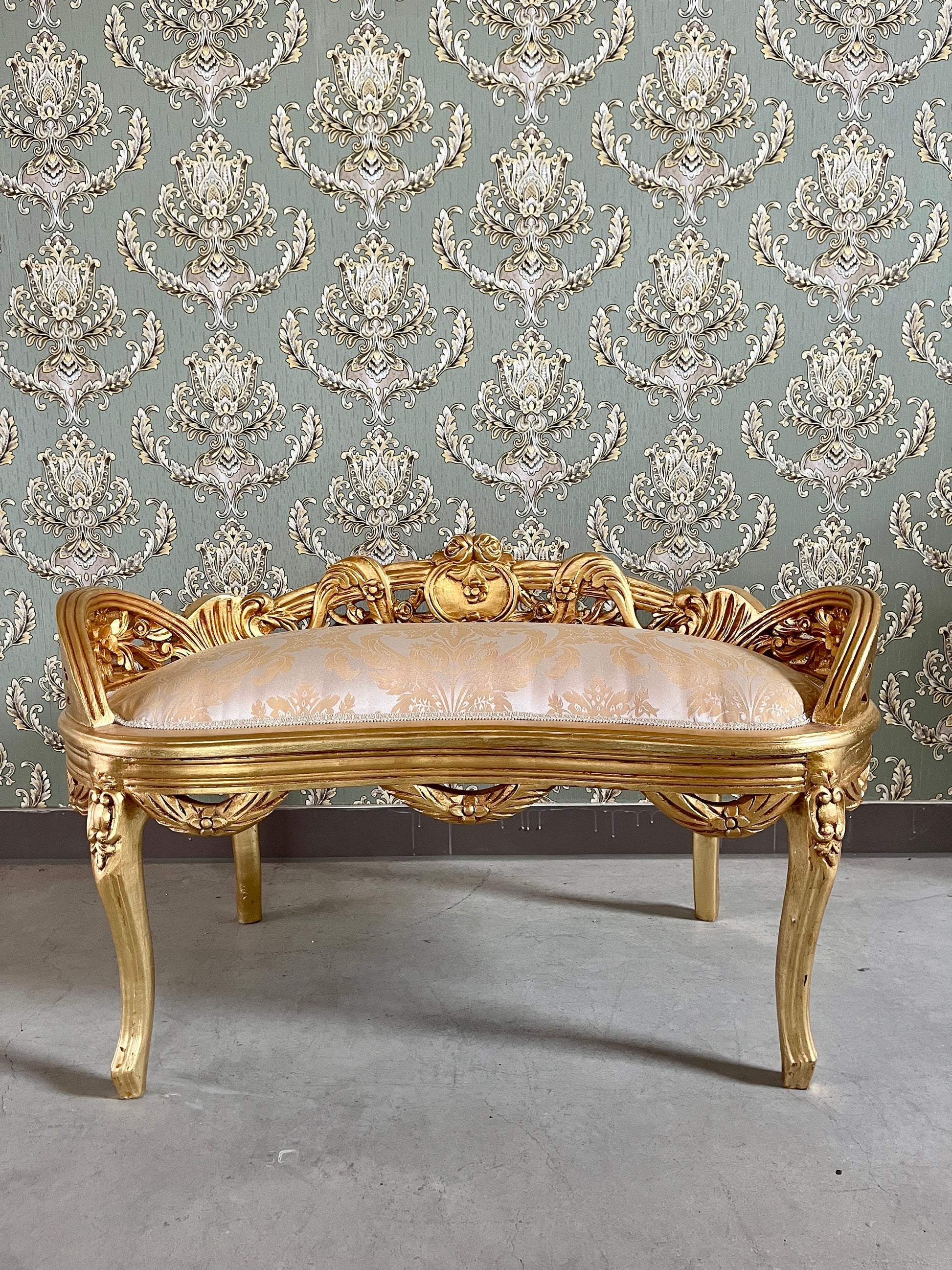 A French Louis style bench in reproduction. It can be a bedroom bench, ottoman or set at entrance.