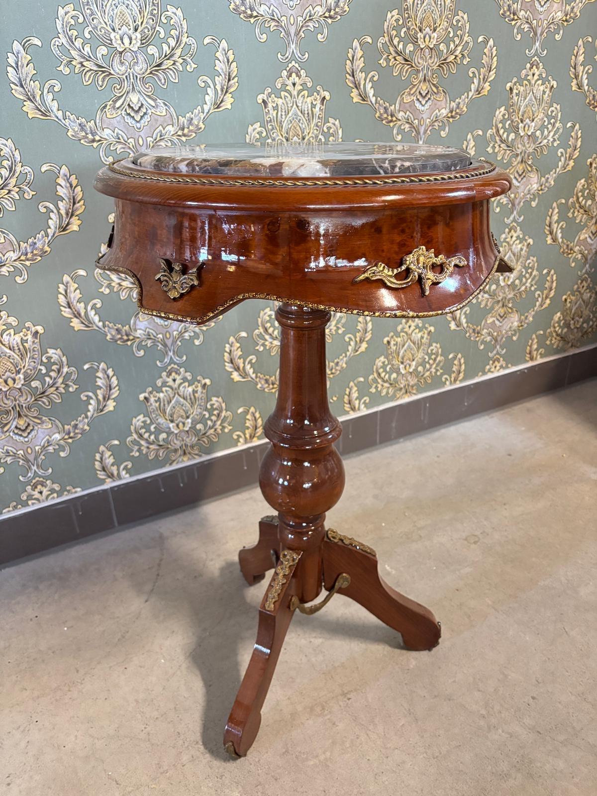 French antique style side table reproduction with a marble slab at top. It’s suitable as for tea or coffee table.