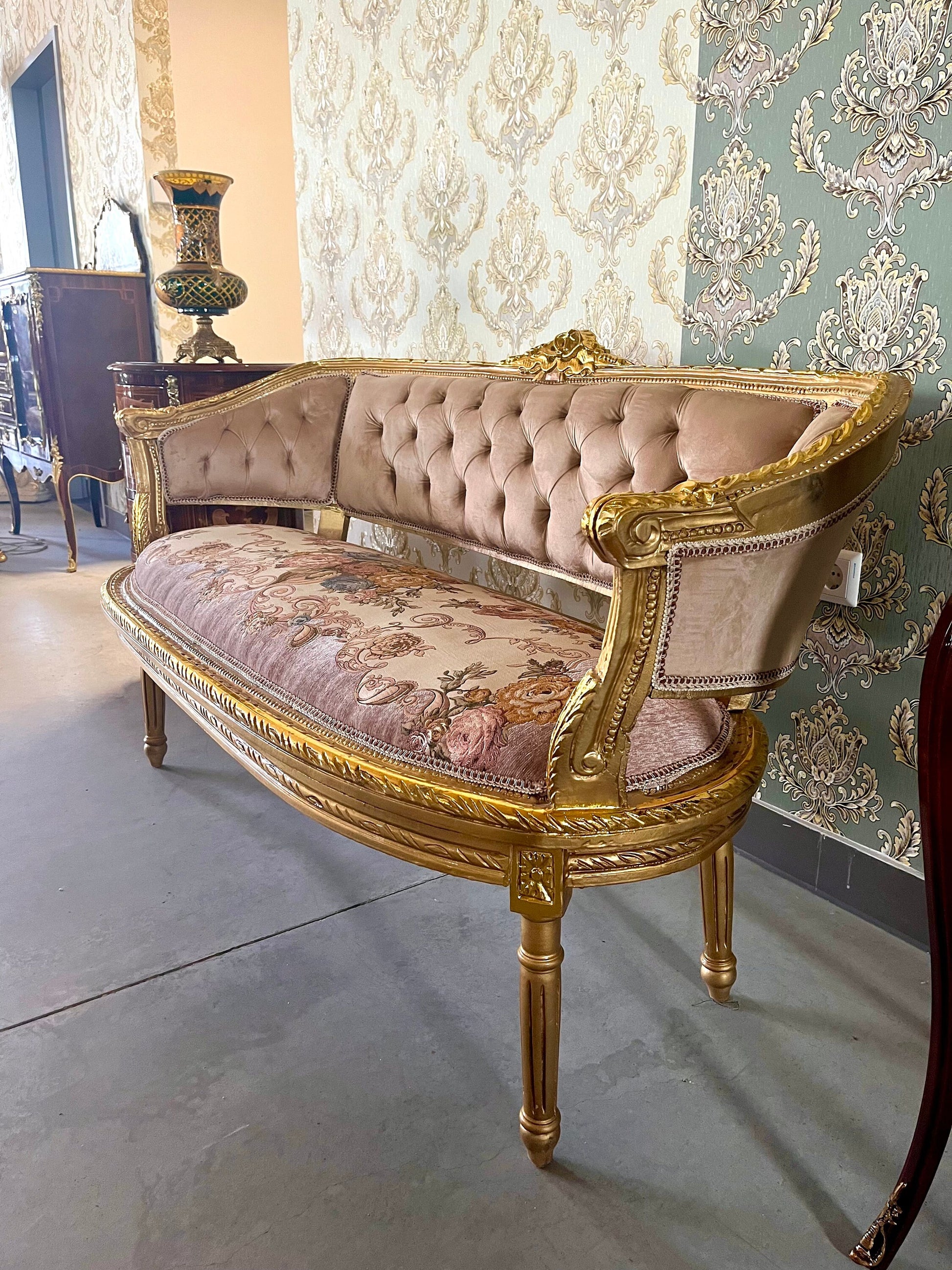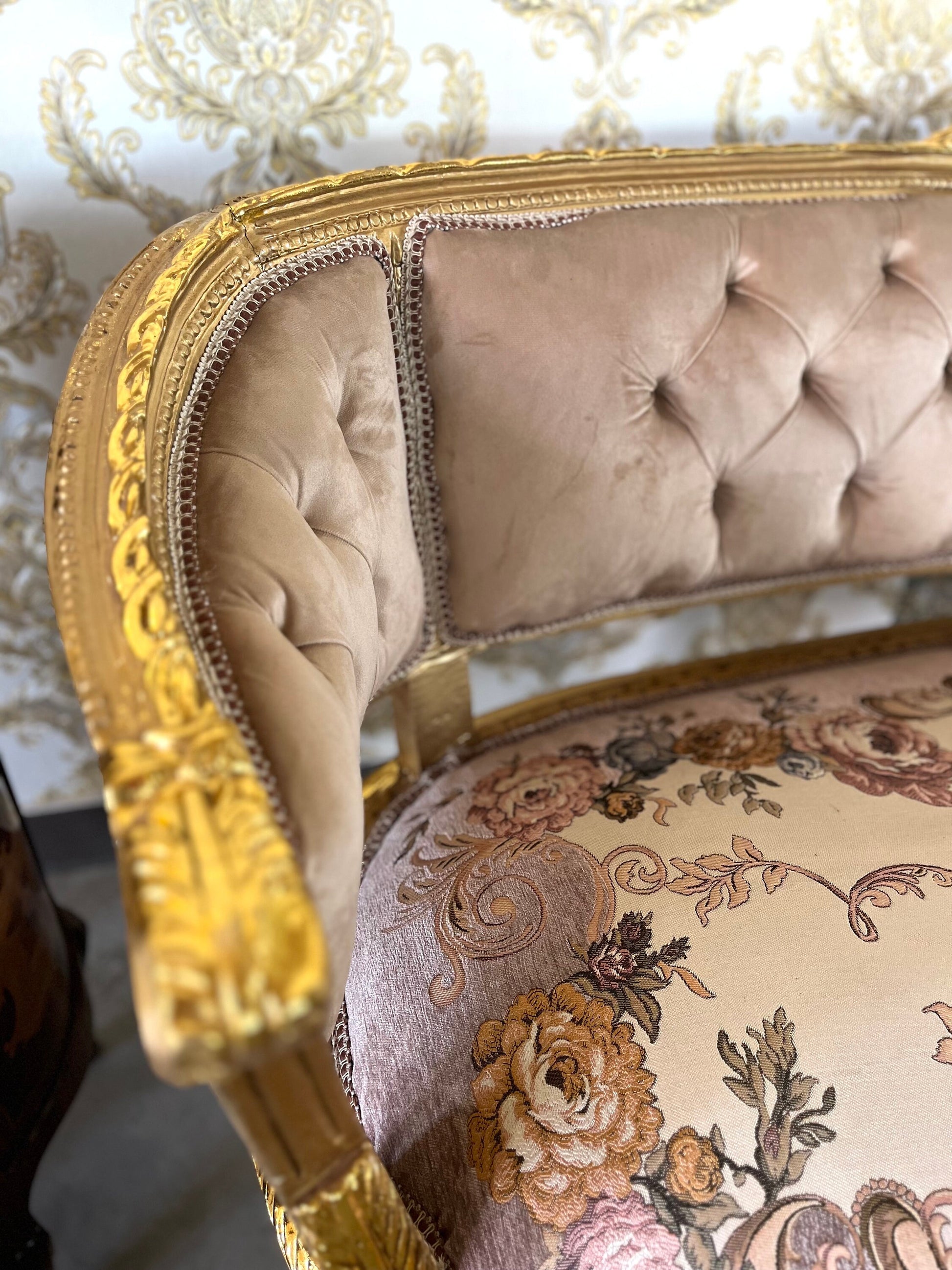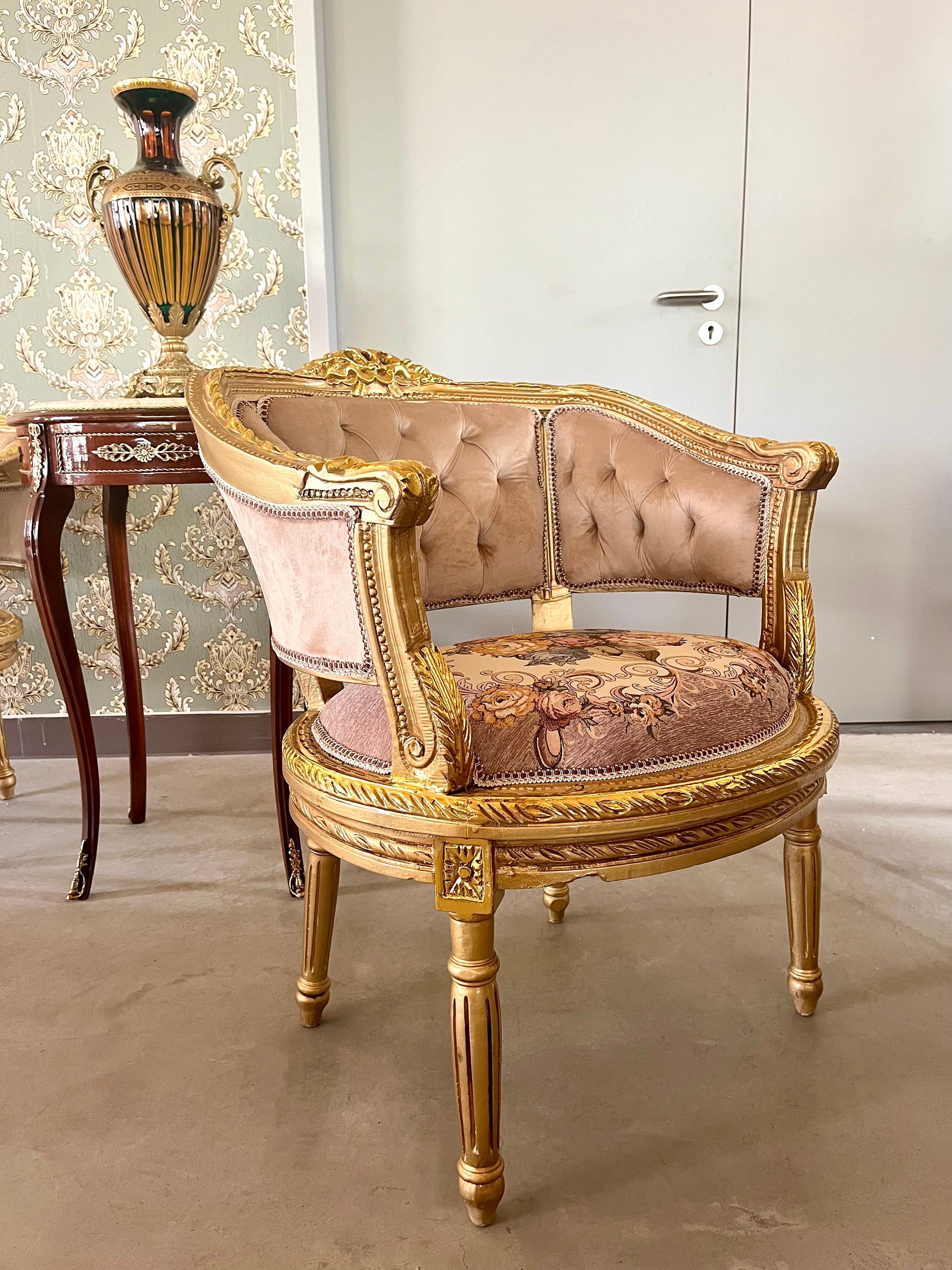 It’s handcrafted from solid beech wood, gilded with gold leaf and upholstered with velvet, silky jacquard fabrics.