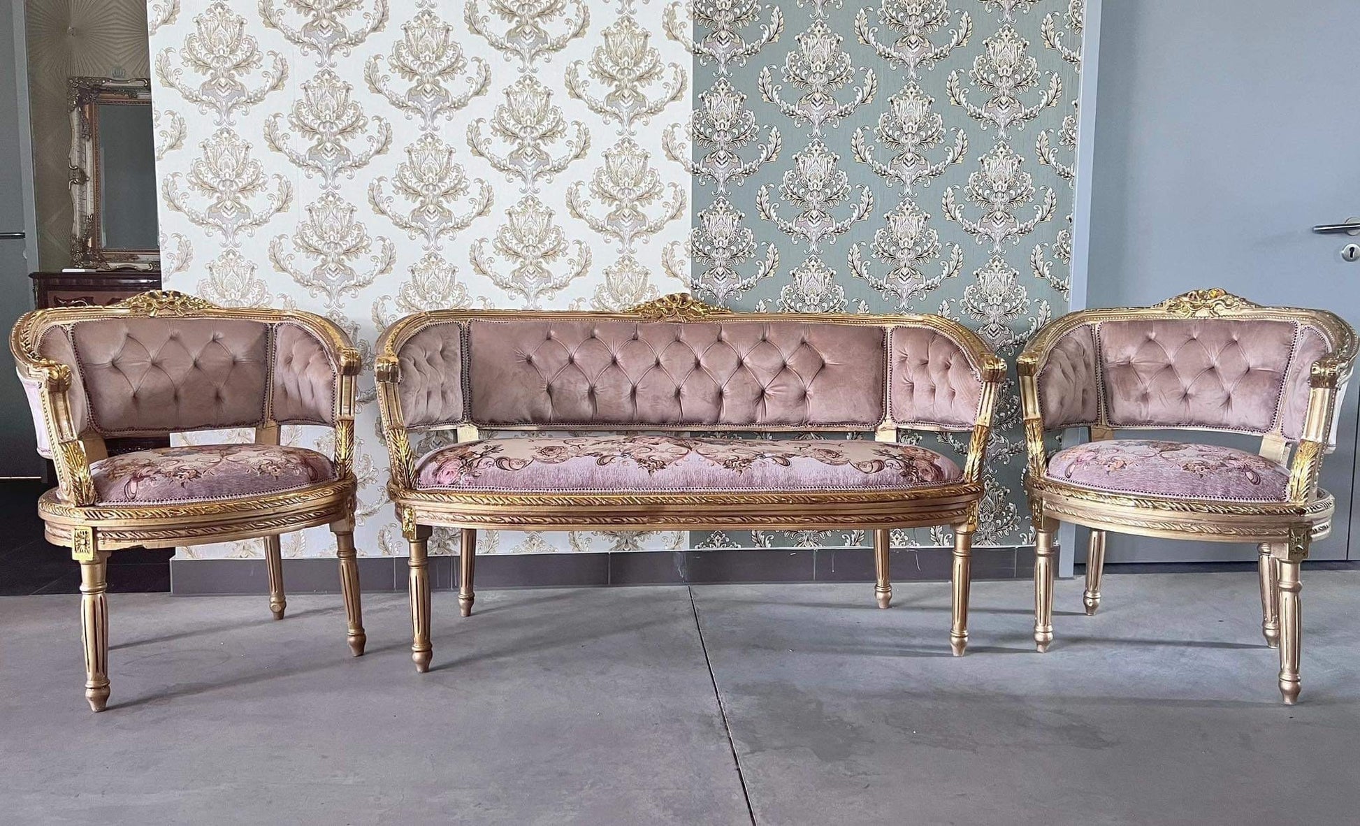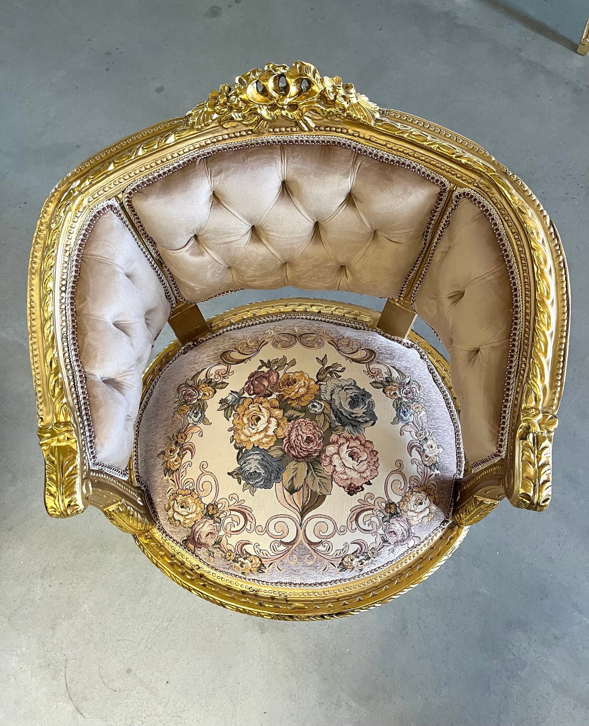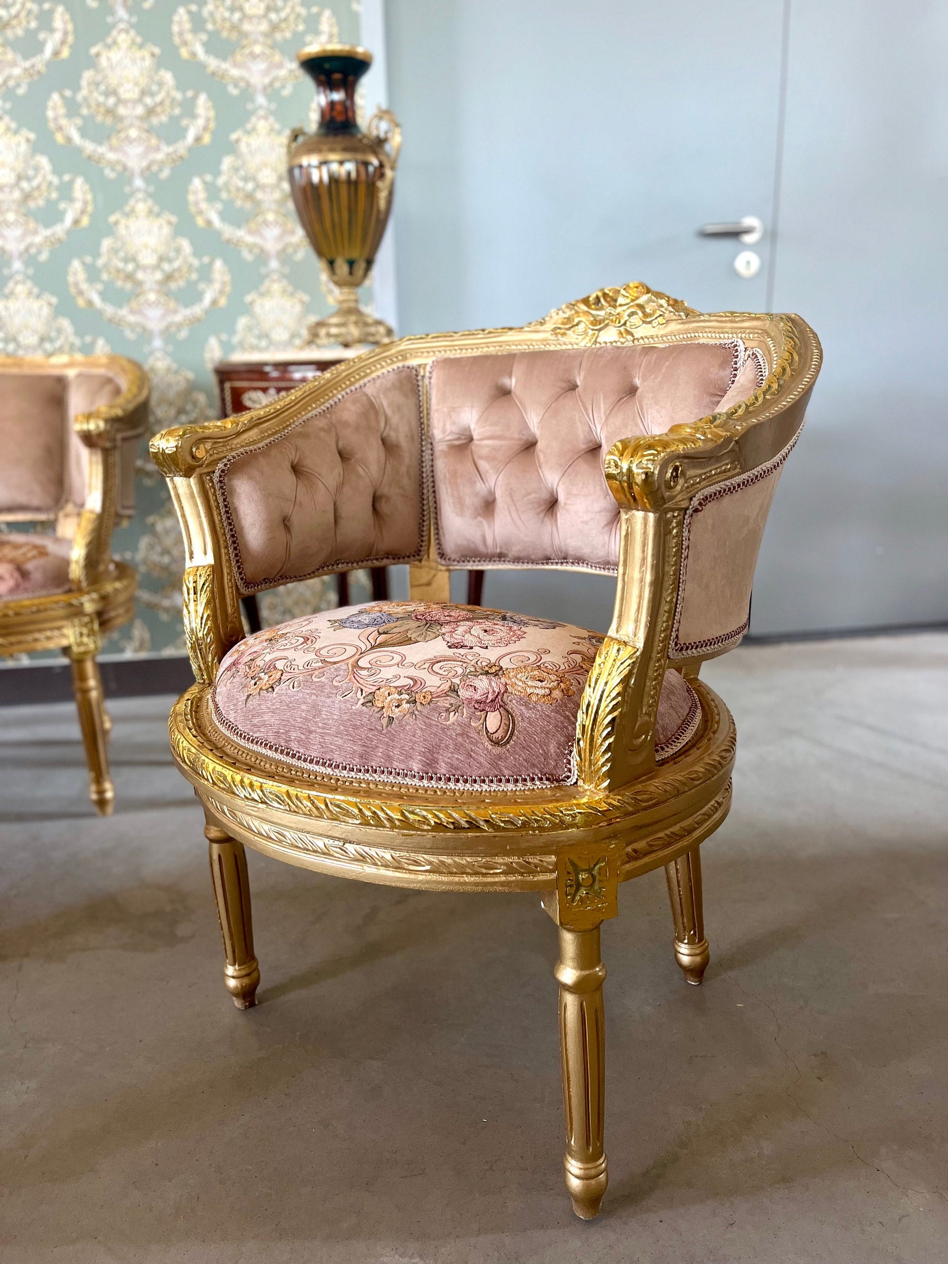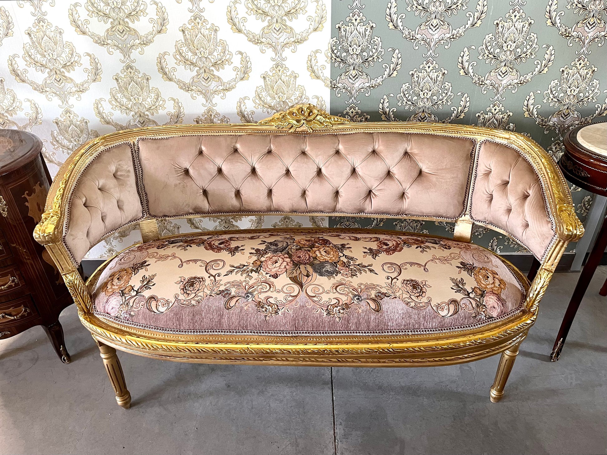 It’s handcrafted from solid beech wood, gilded with gold leaf and upholstered with velvet, silky jacquard fabrics.