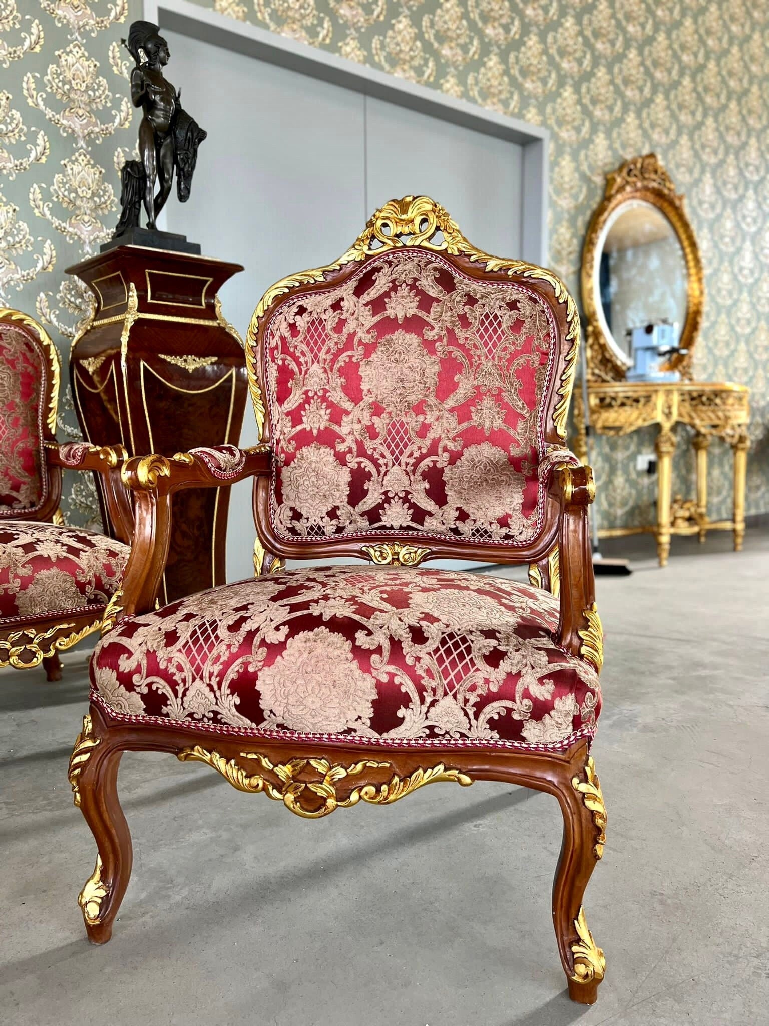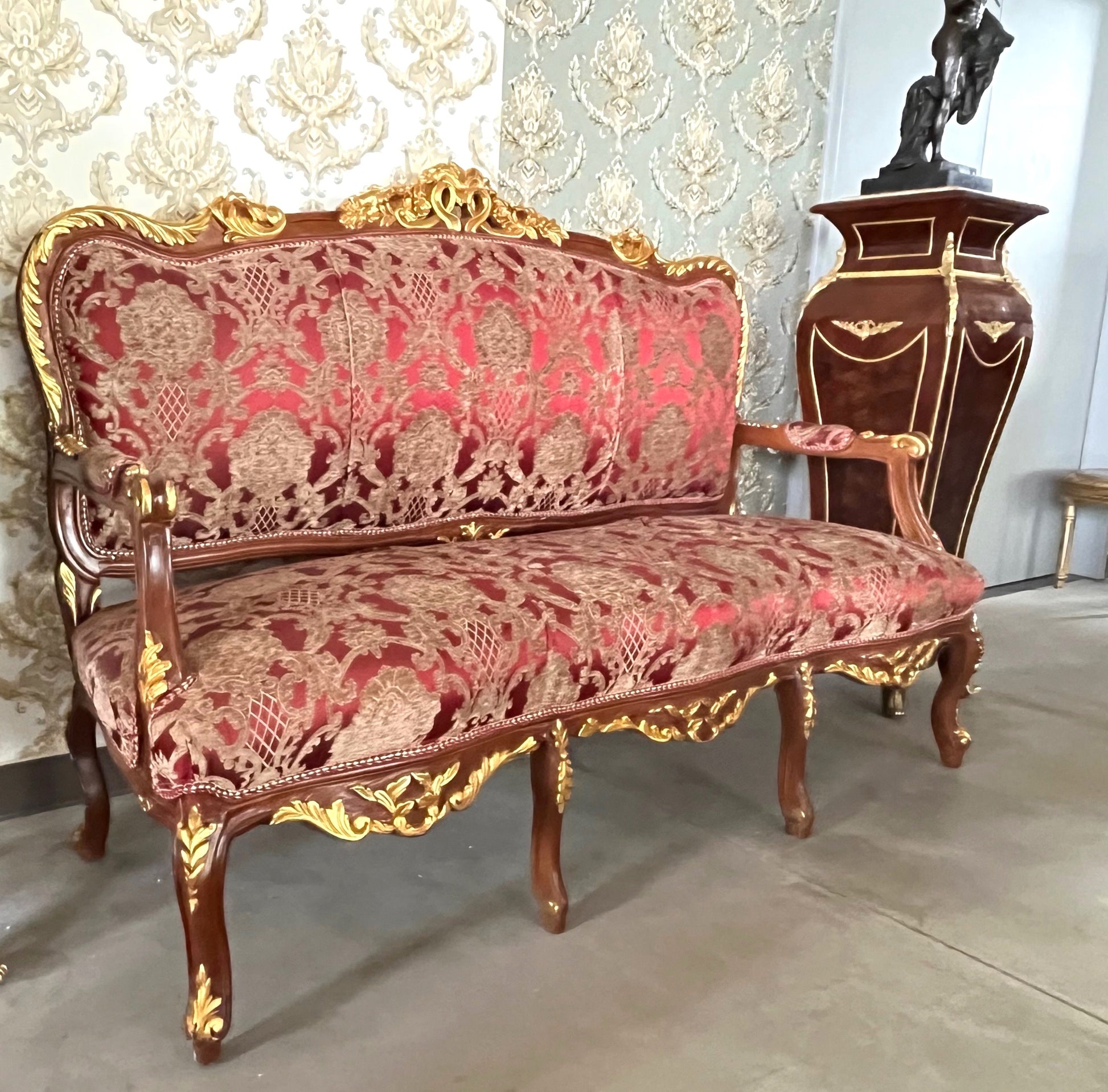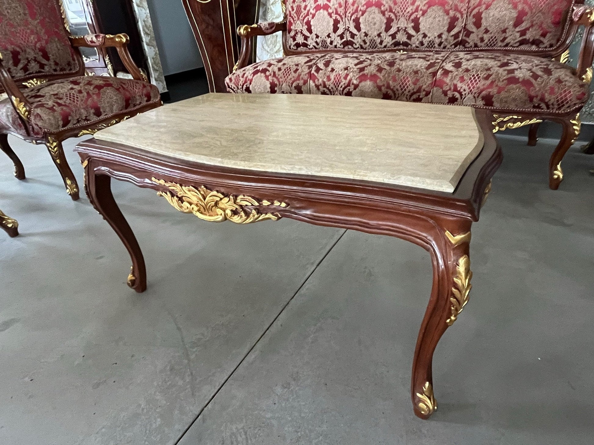 The full set is hand carved from solid beech wood, small marble piece from Italy, and partial gilded in gold leaf and upholstered with silky jacquard fabric from Turkey.