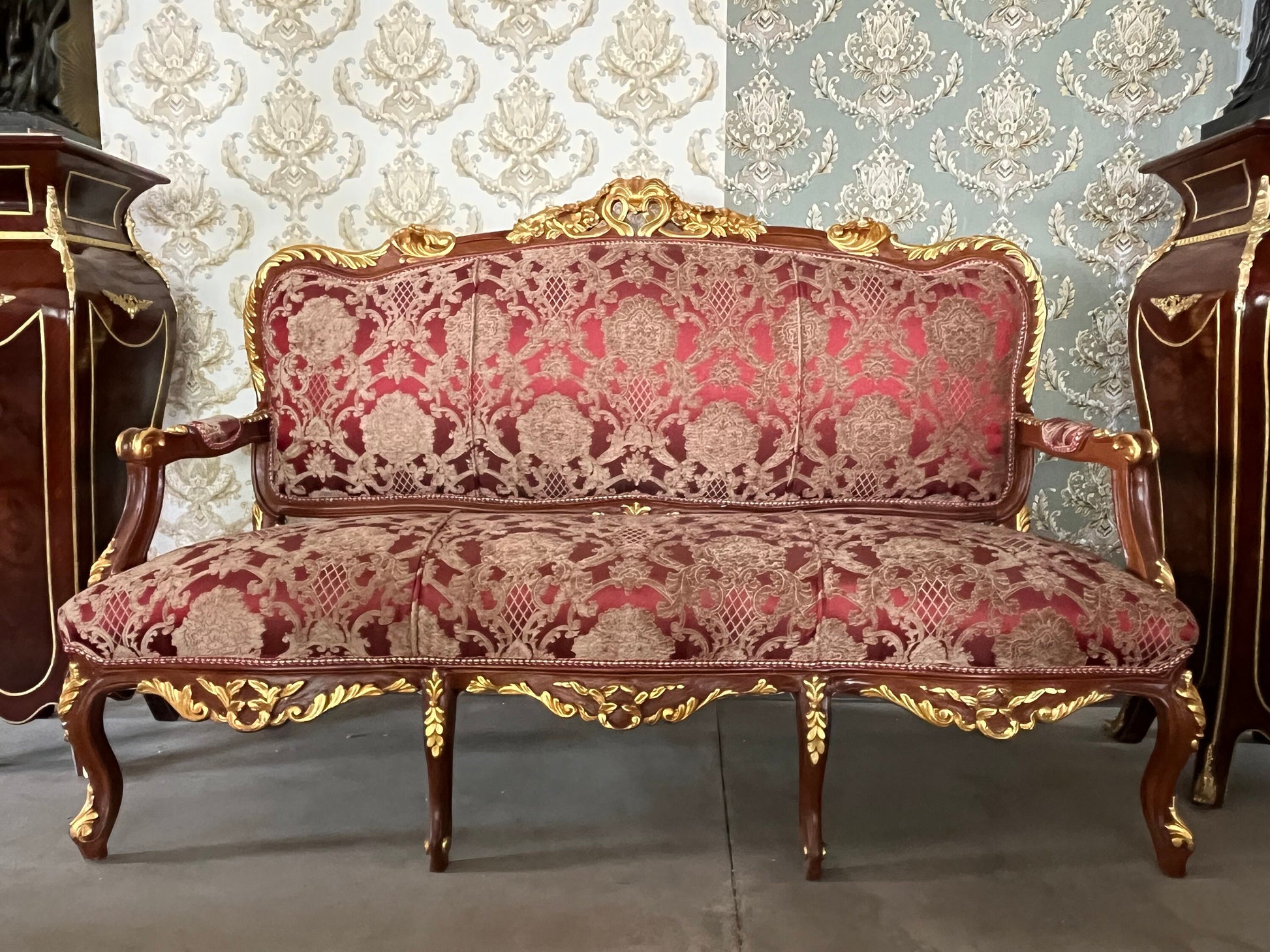 Sofa Set Bordeaux Flower Pattern French Antique Style Sofa Set in Red Royal Baroque Style Sofa Set For Home Lounge Room For Hotel Lobby