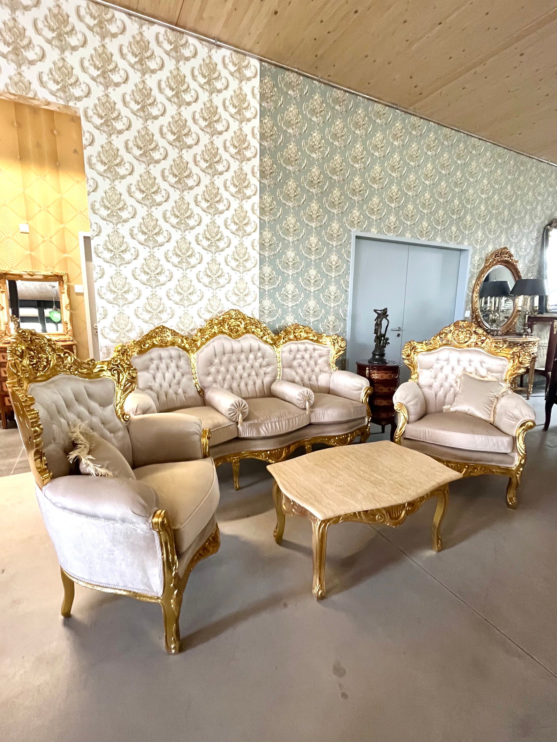 Sofa Set French Louis XV Style Tufted Velvet Beige Color in Gold Finish Marble Top Coffee Table Retro Baroque Style Sofa Set