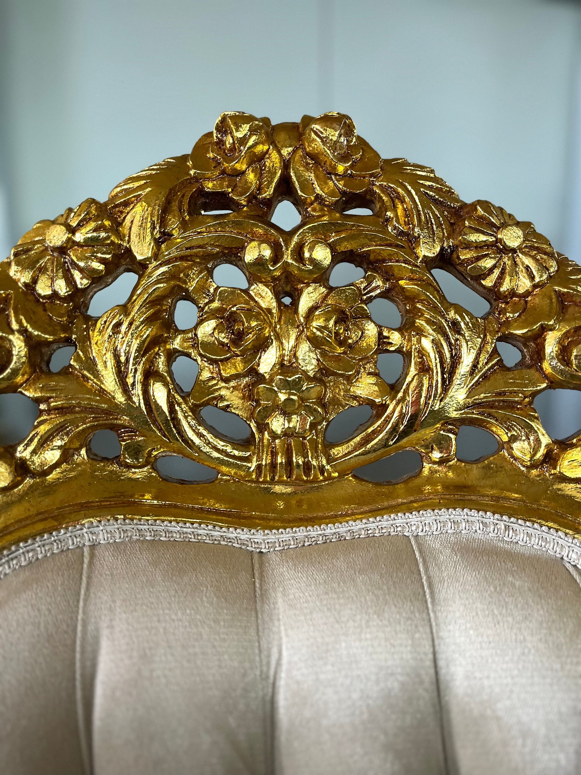 Handcrafted in solid beech wool, upholstered in embroidered silk-like polyester fabric, gilded with foil gold leaf, and a marble slab cafe table.