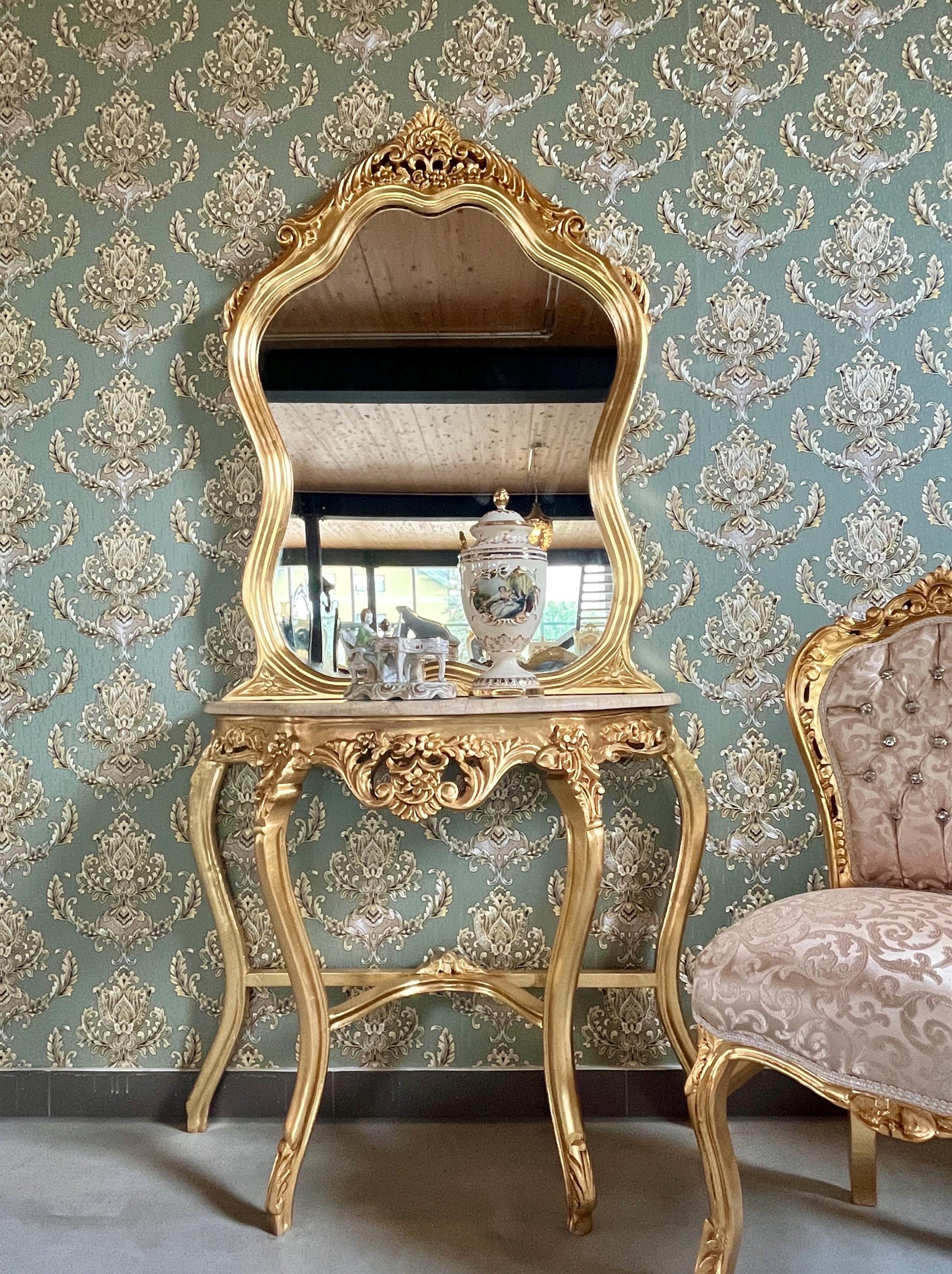 Table Console & Mirror Retro Baroque Style with Beige Marble Top Handcrafted Wooden Table in Gold Finish