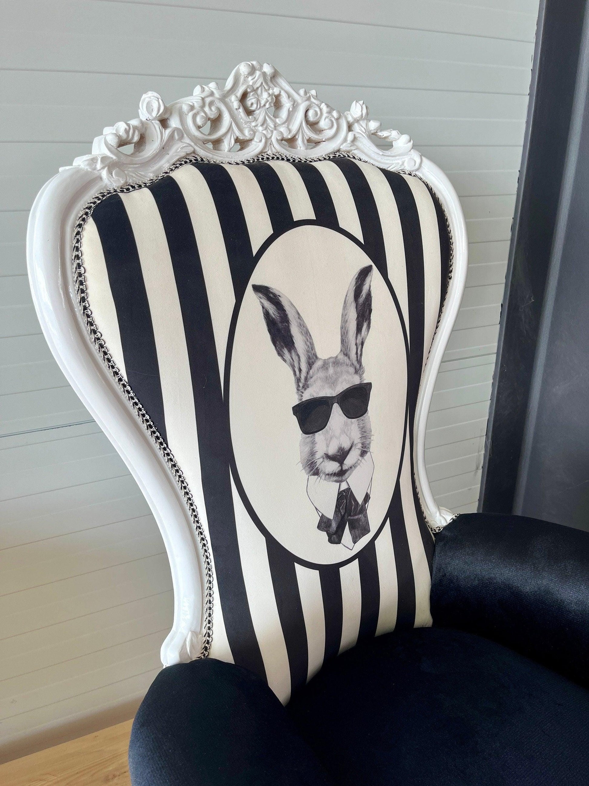 Accent Armchair in Black & White Color Velvet Funny Rabbit Print Huge Armchair for Birthday Party for Kids Event or Commercial Display