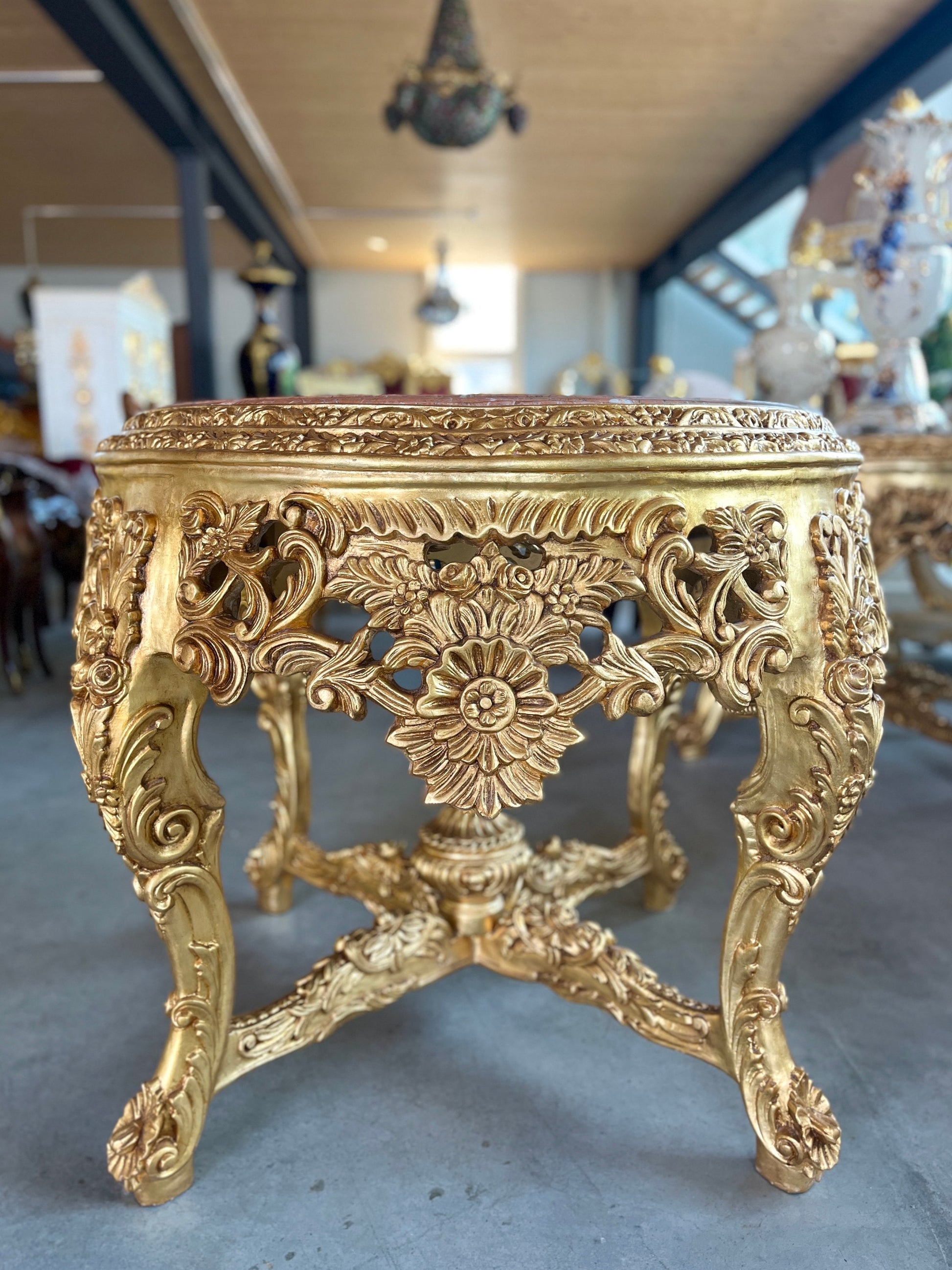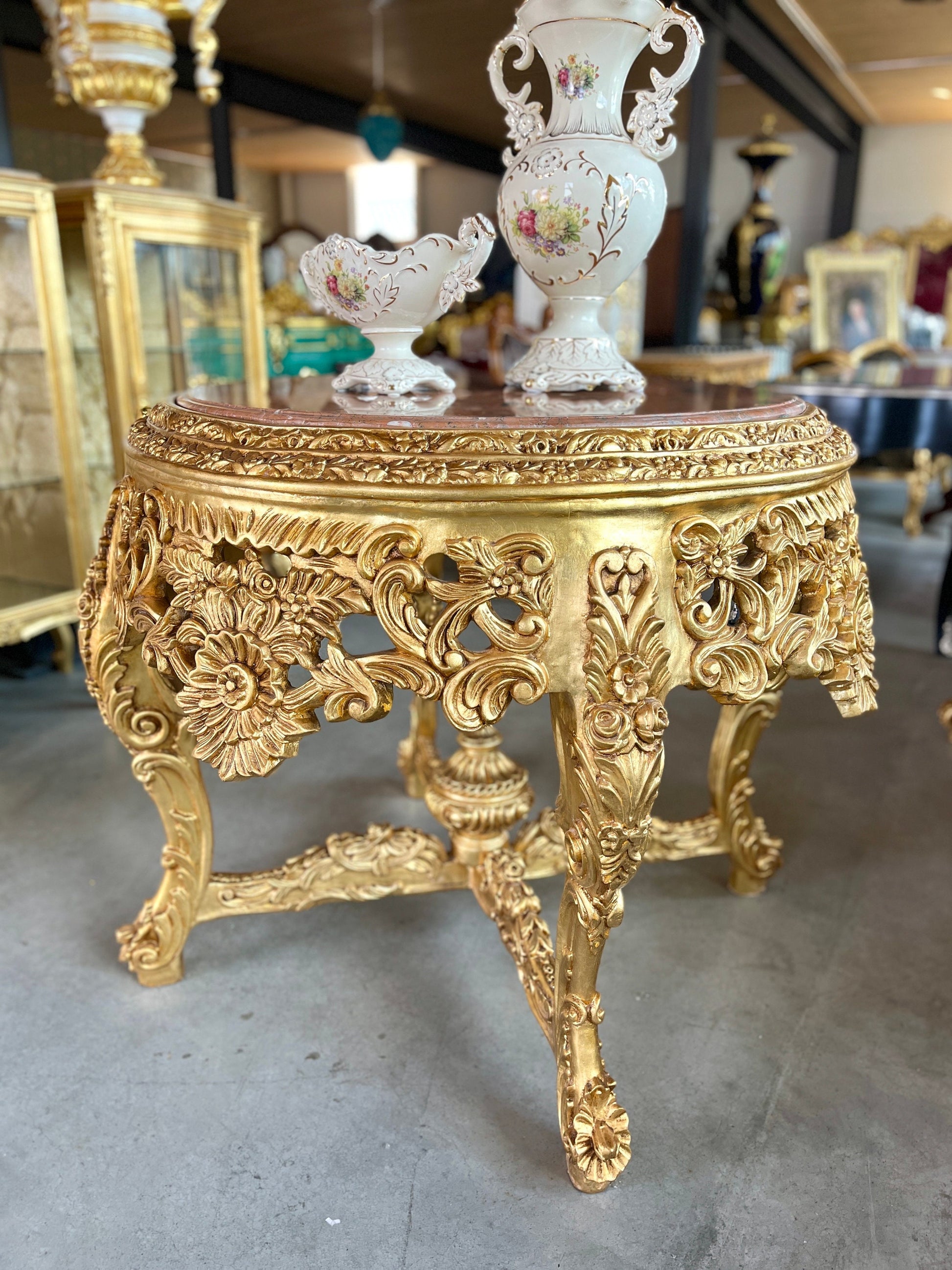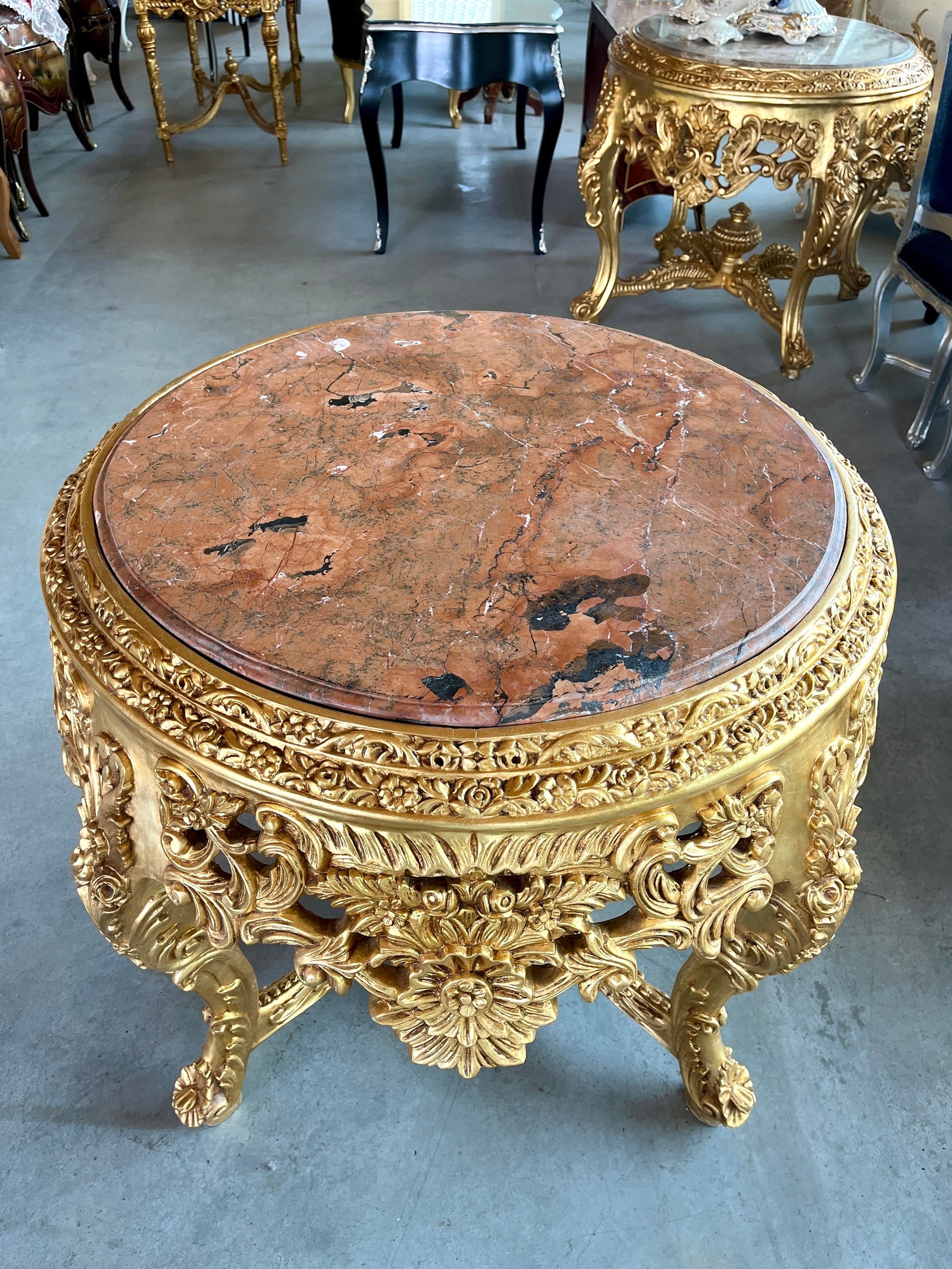 This retro luxurious baroque style table is a beautiful decorative piece for your home or hotel lobby. It consists of a round marble top in orange colour and golden frame.