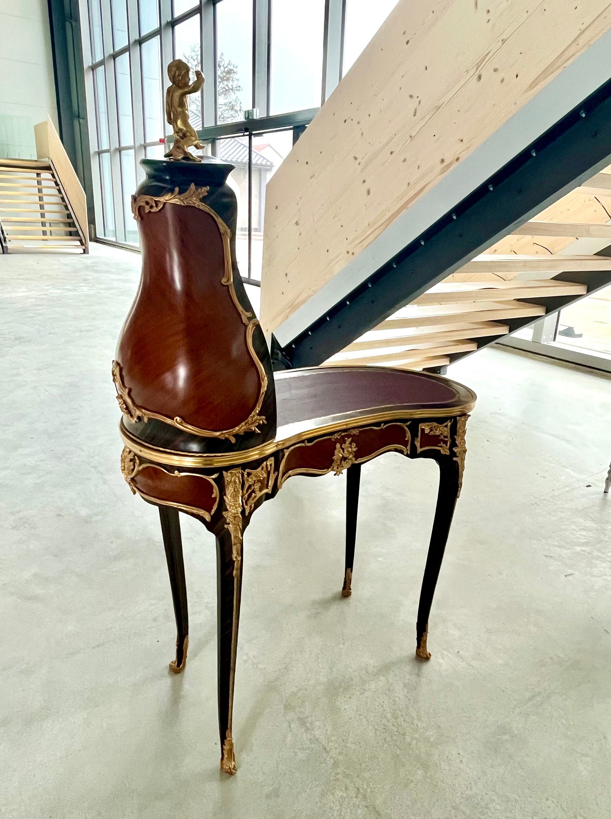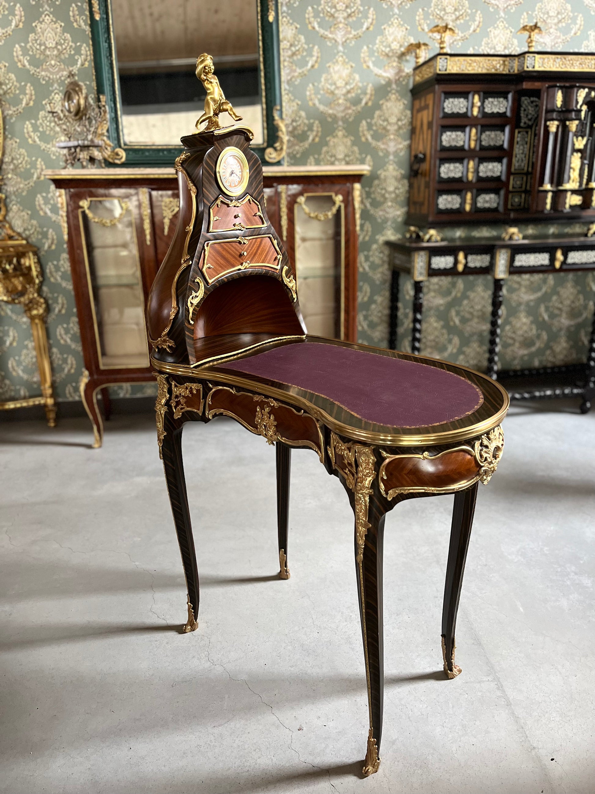 Handcrafted in solid wood with mahogany top plate and bronze ornaments all around. There are 2 small drawers under the small clock and another drawer inlaid the desk.