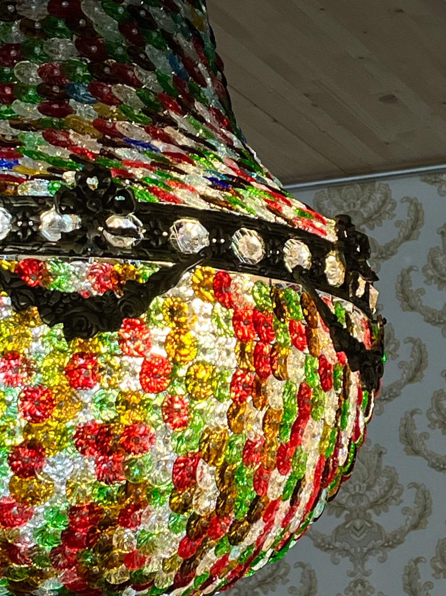 It is antique baroque or rococo style in reproduction. Handcrafted with transparent or colorful glass ornaments and antique oxidised bronze finish. It represents a retro accent charm.
