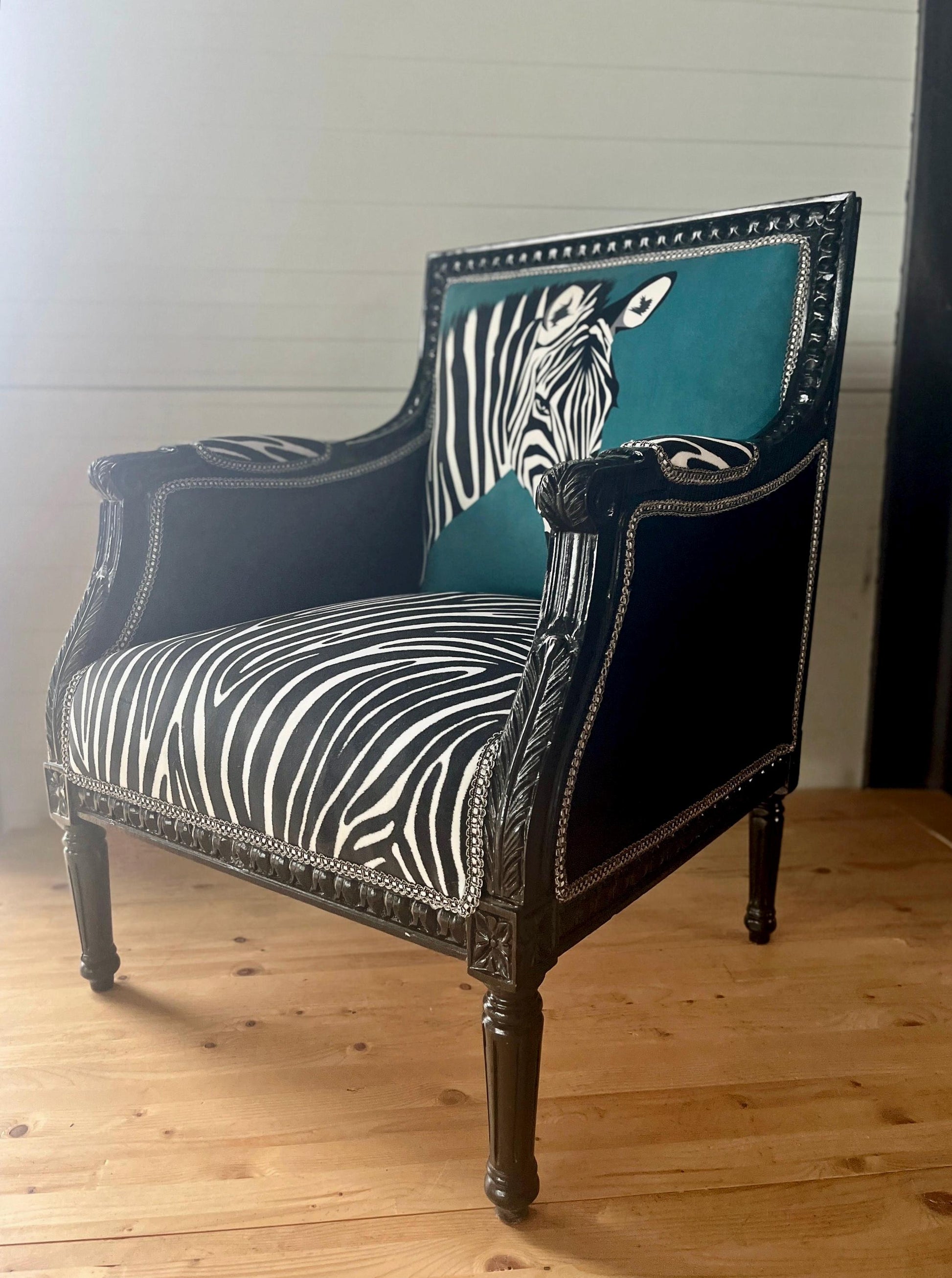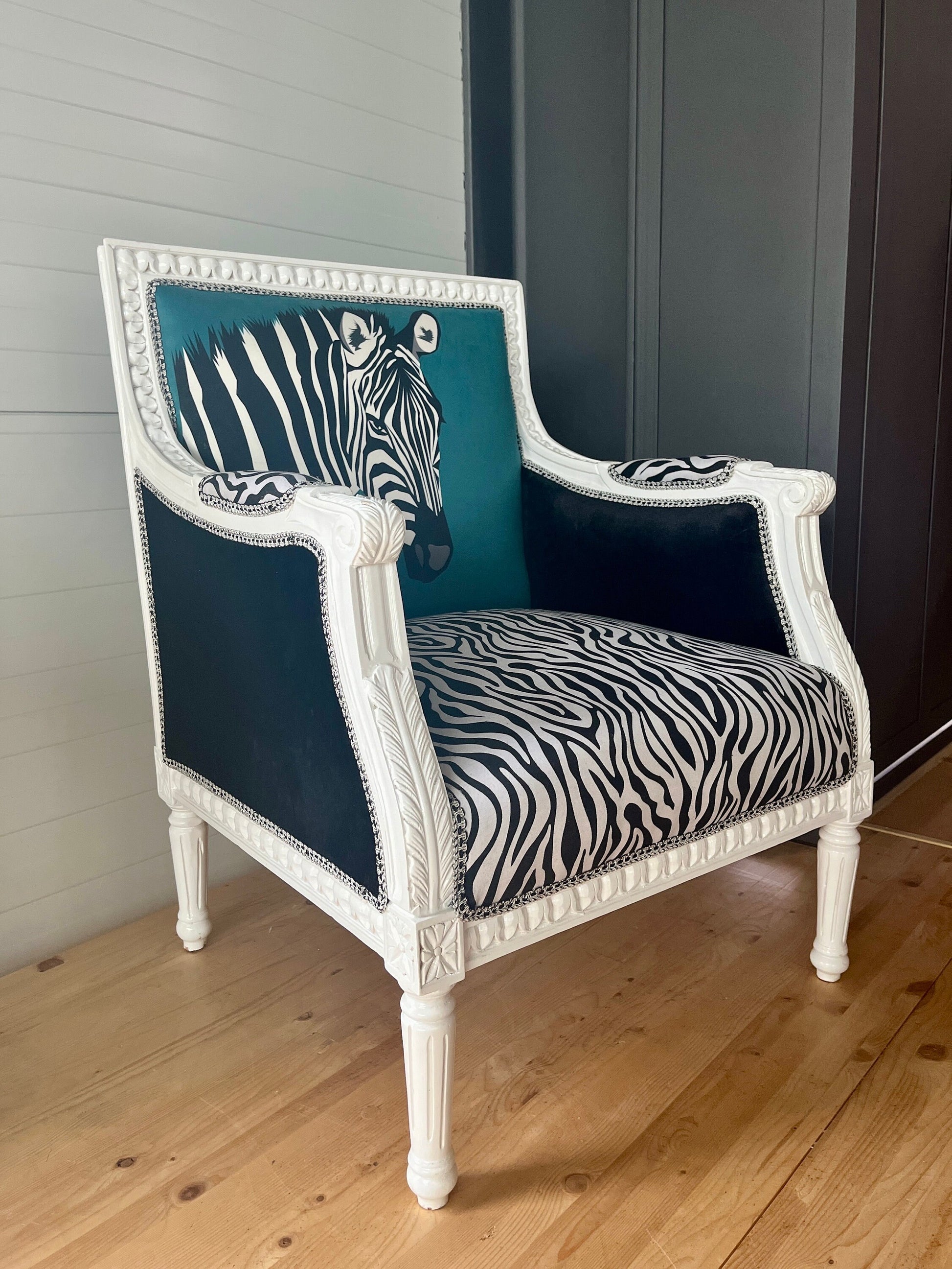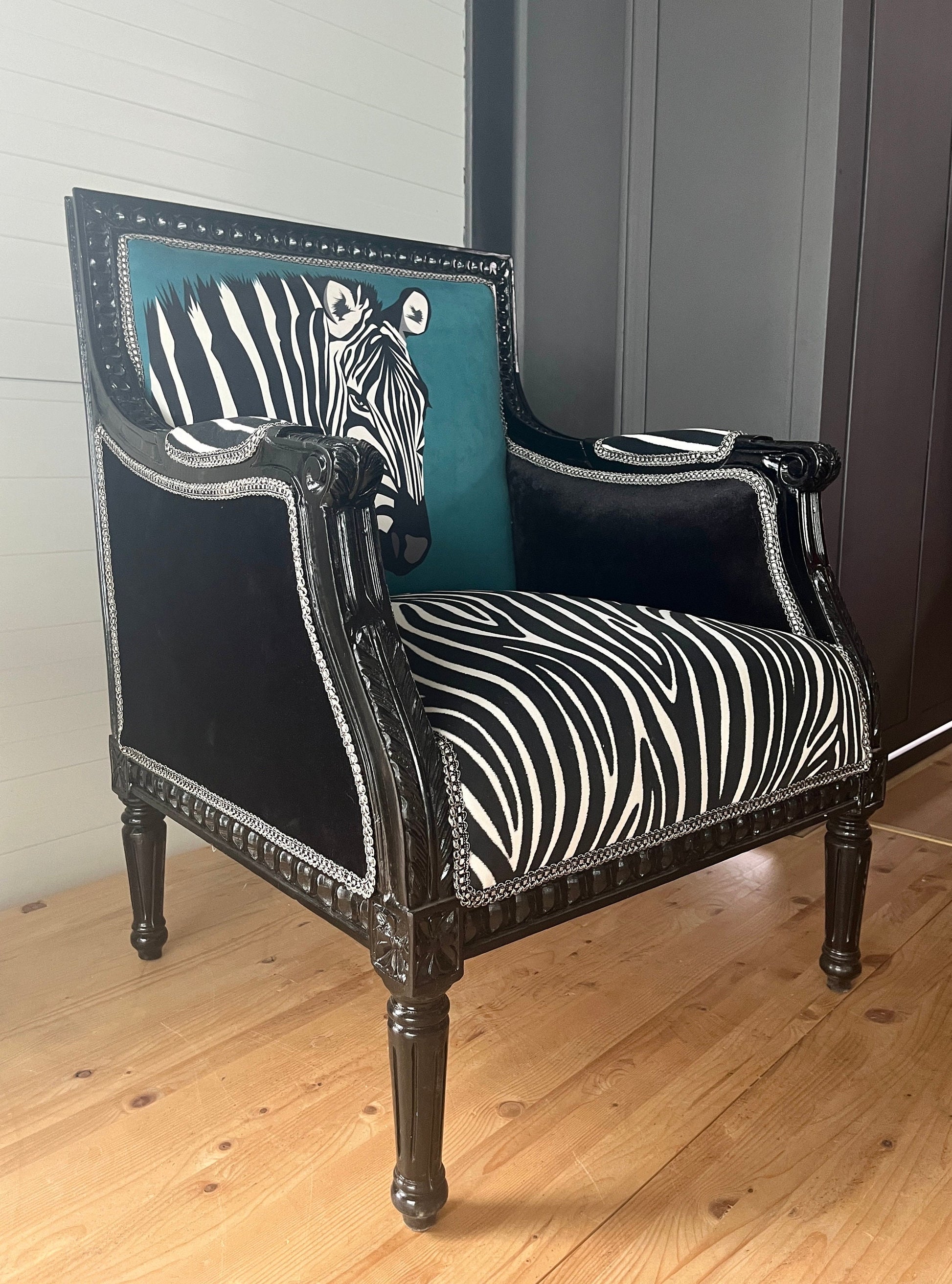 A classic square shape armchair in black or white frame with a cool matching zebra print.