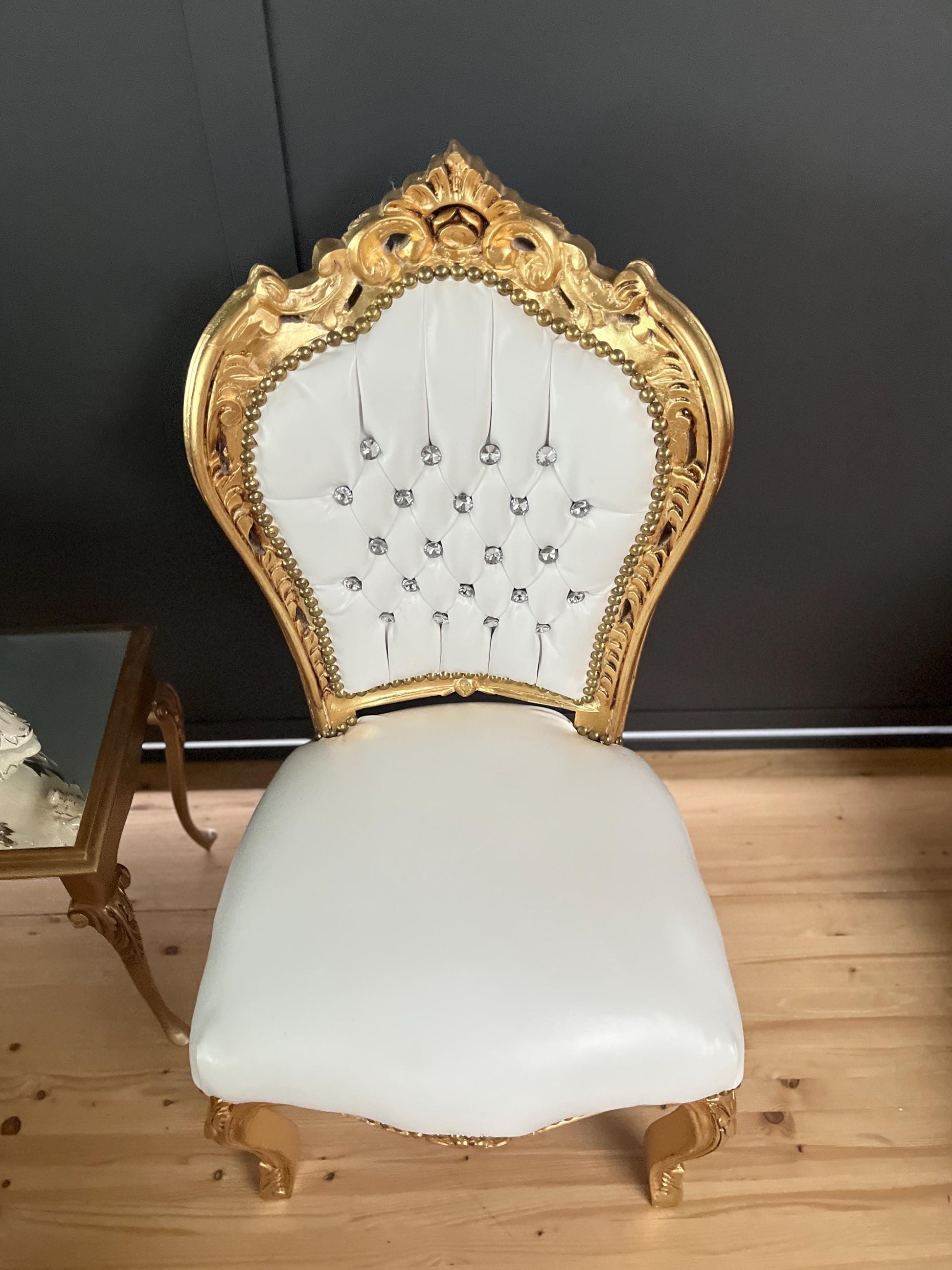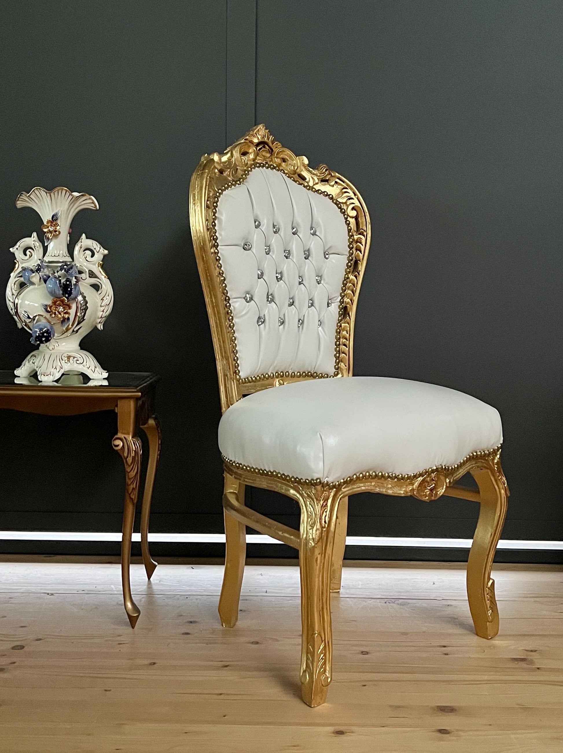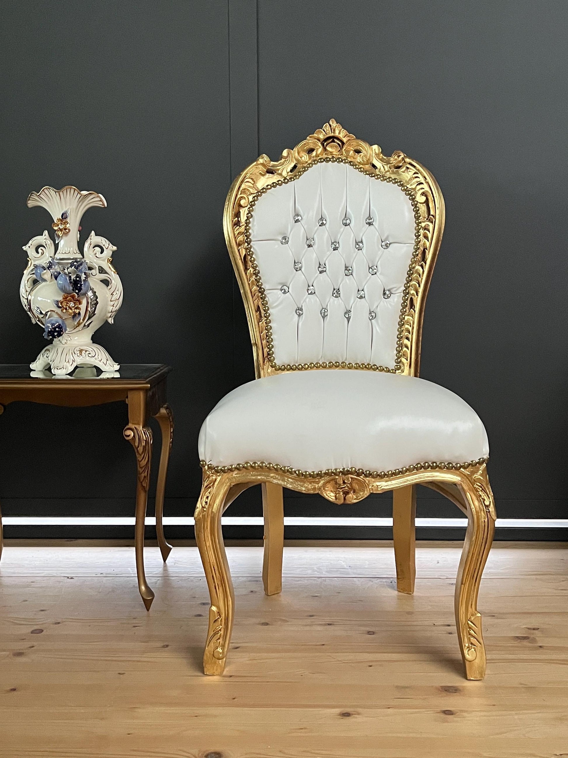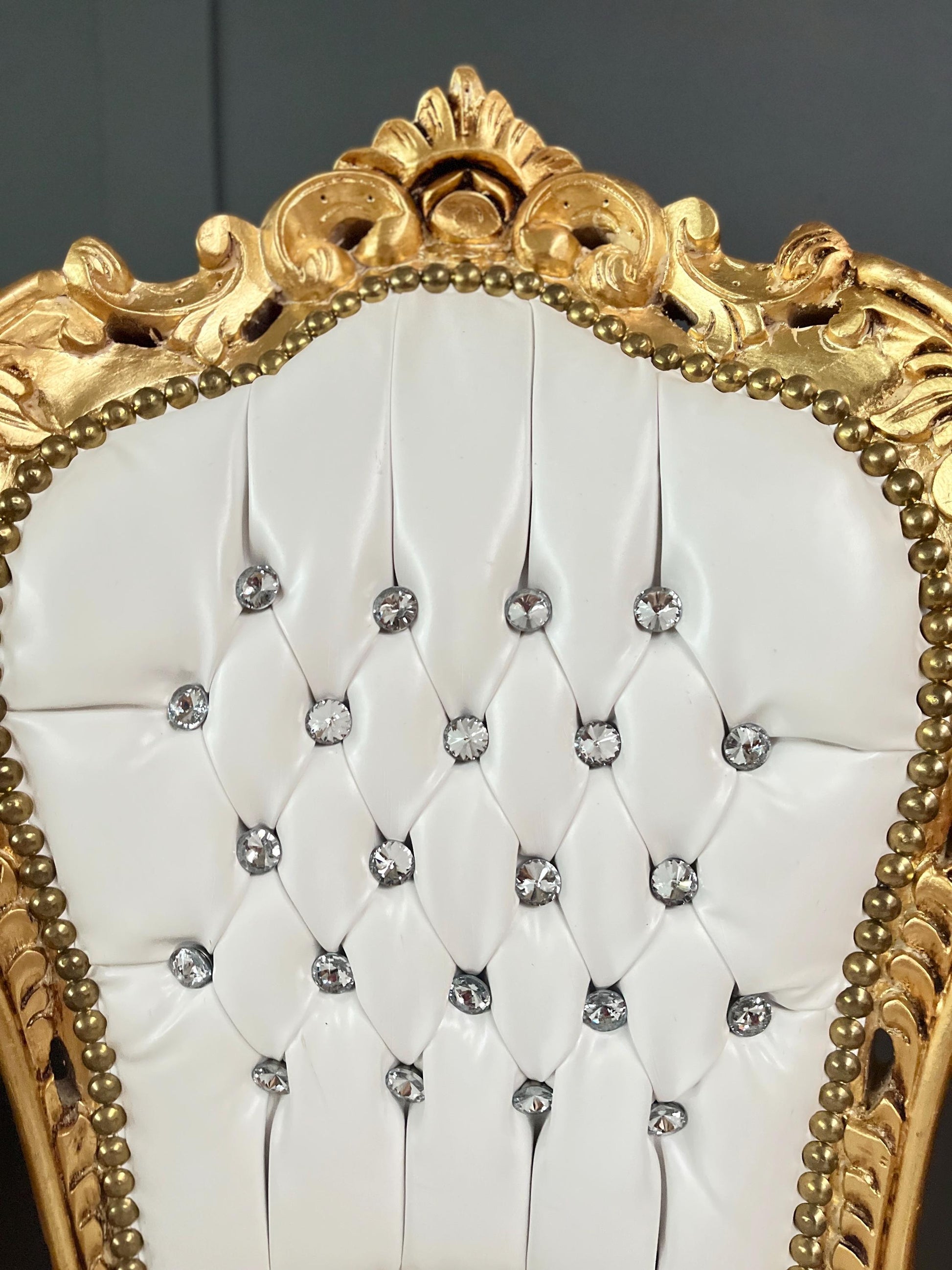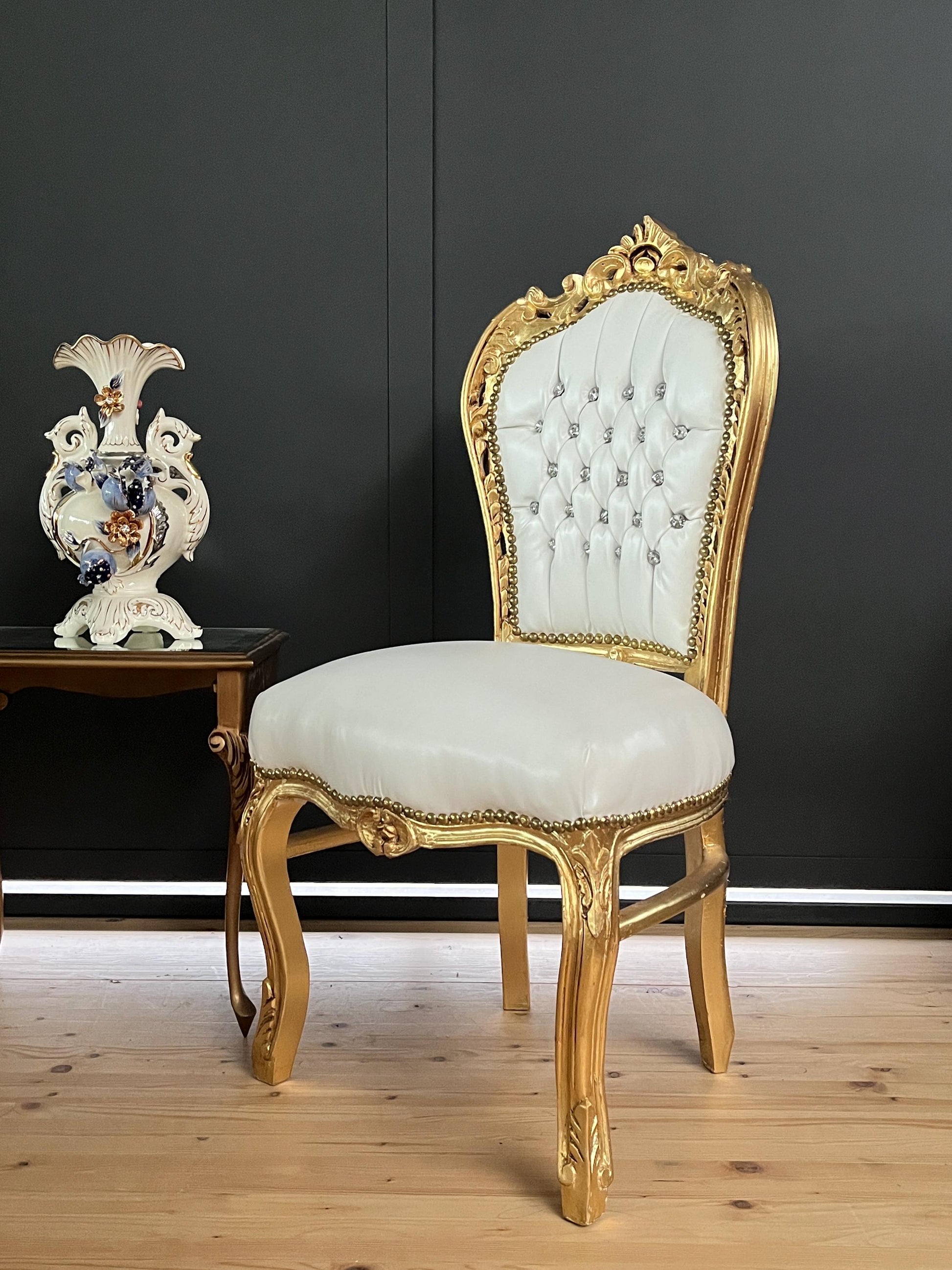 Upholstered with white faux leather, handcrafted in solid beech wood, crystal ornaments, and gilded with gold foil leaf. Each piece is uniquely made. It definitely brightens up in dining area!