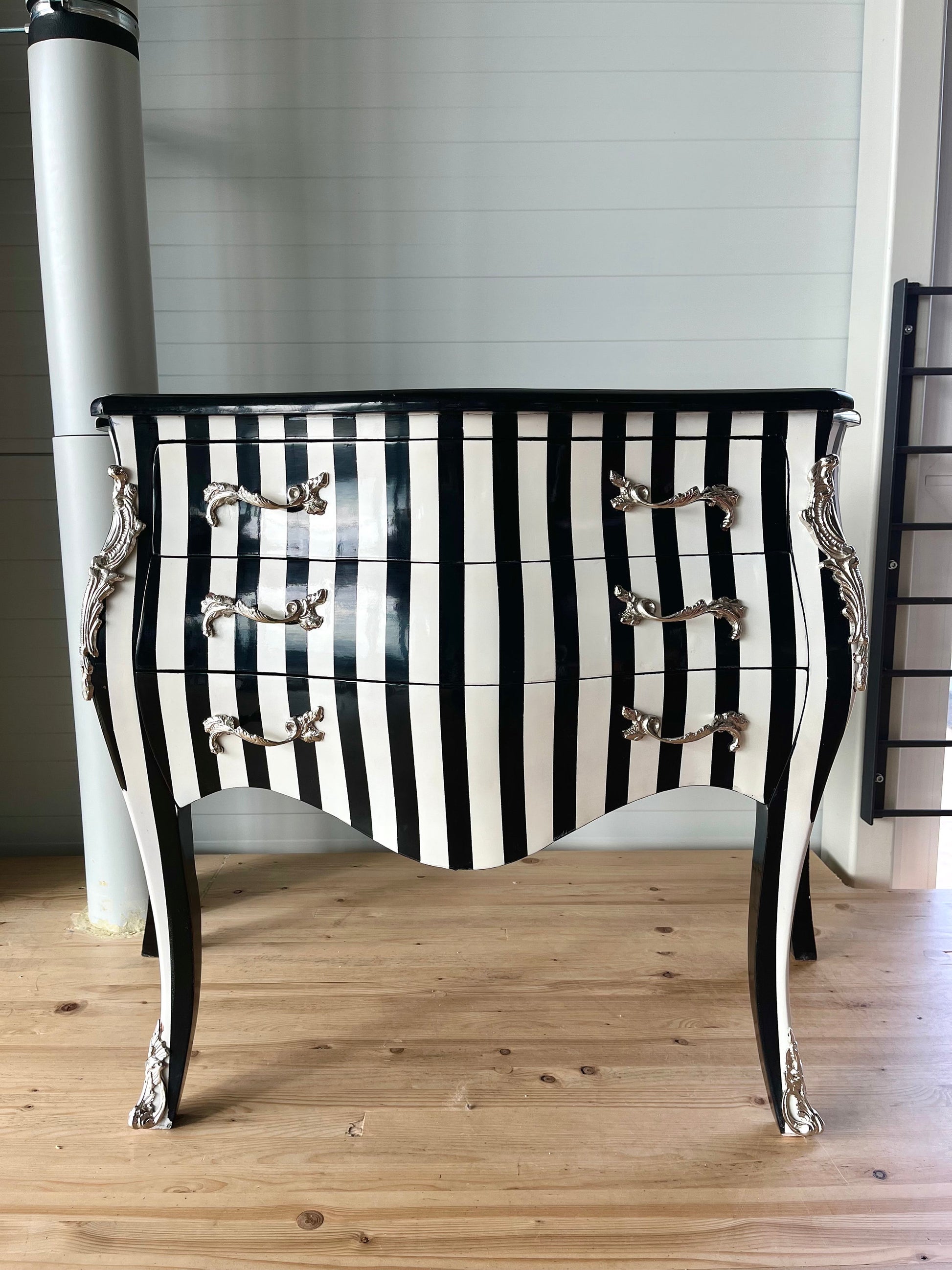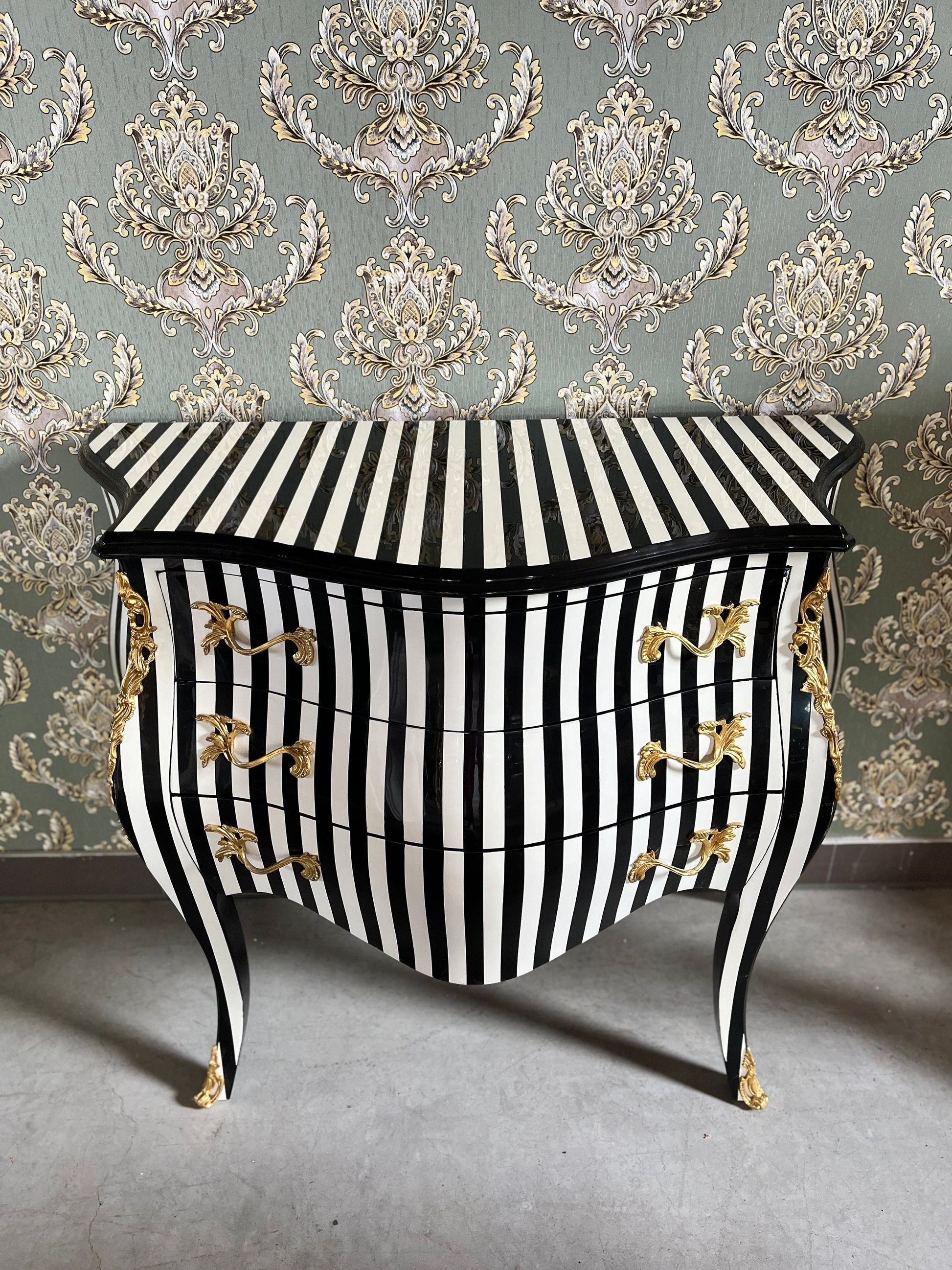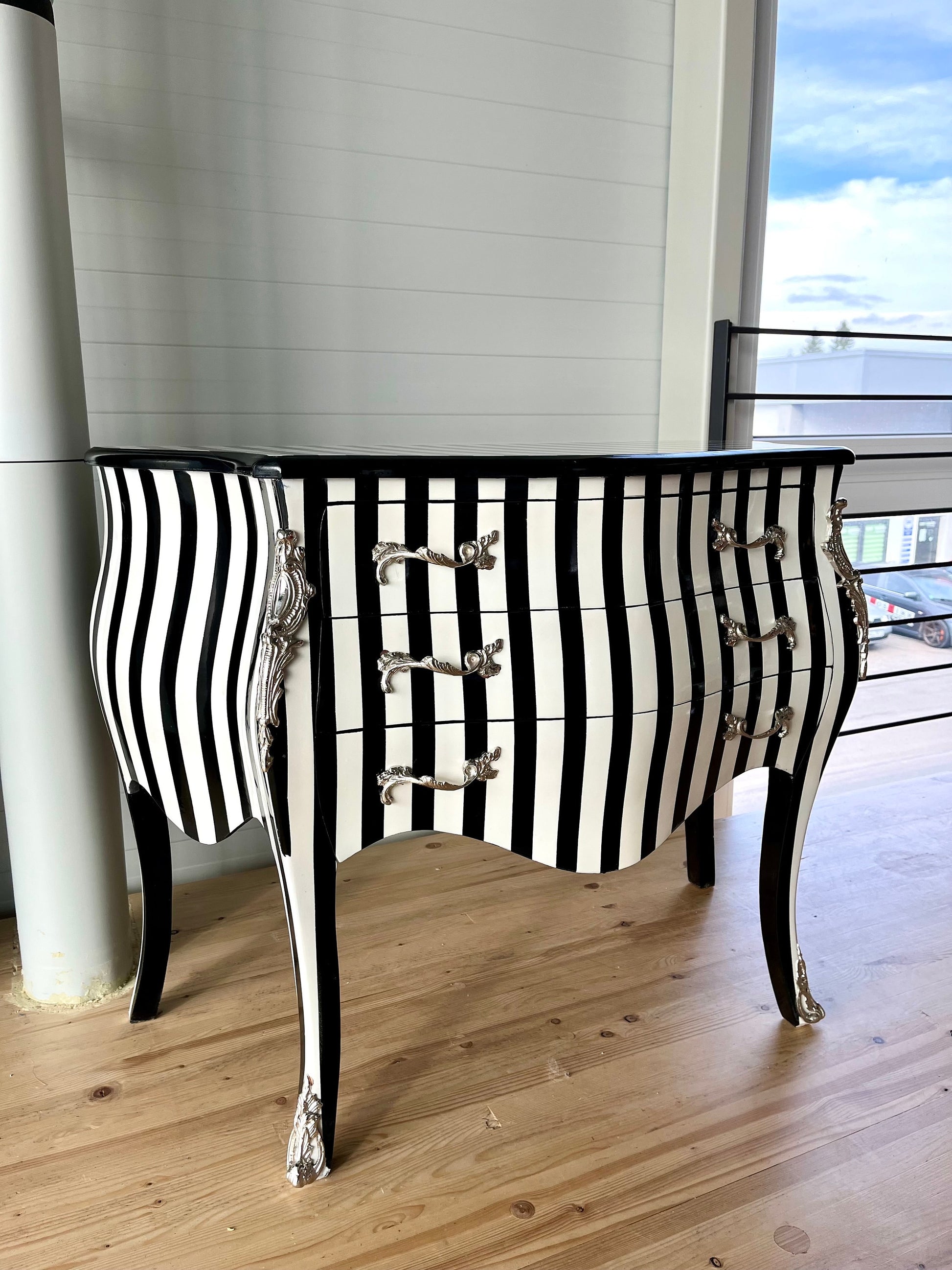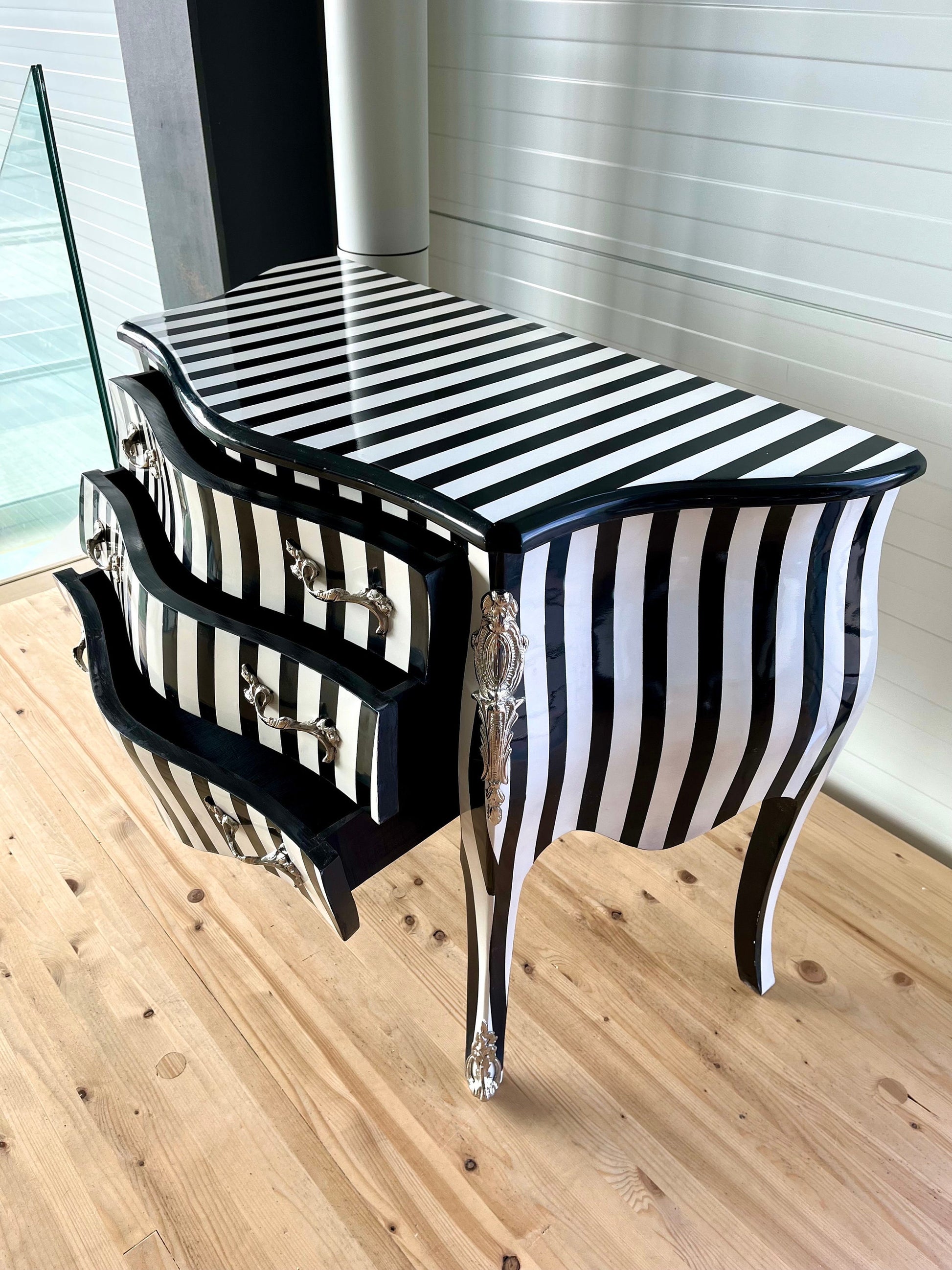 Deluxe wooden chest of drawer in black stripe. This classic style is from French Louis XVI reproduction with bronze handles and inlaid with 3 drawers.