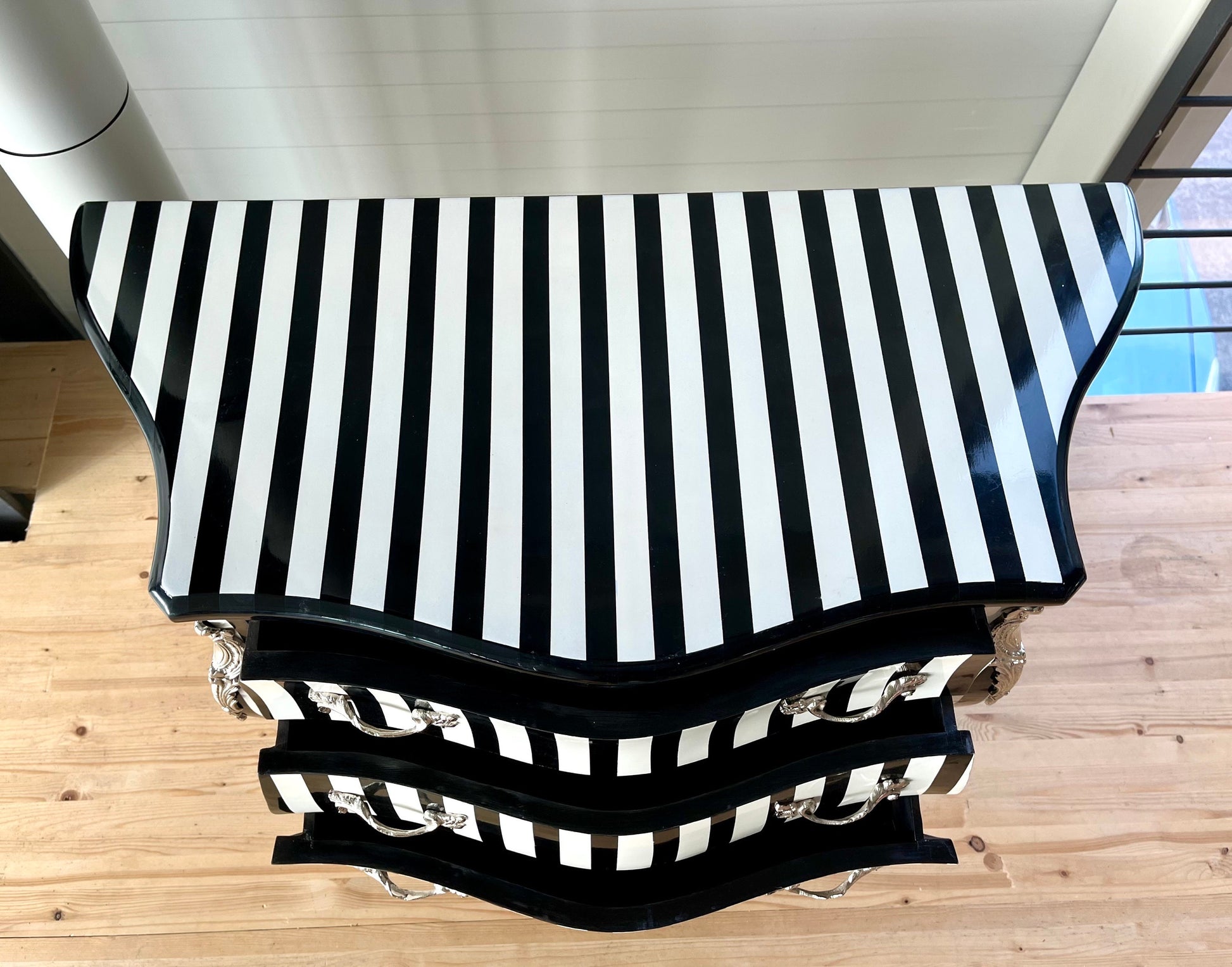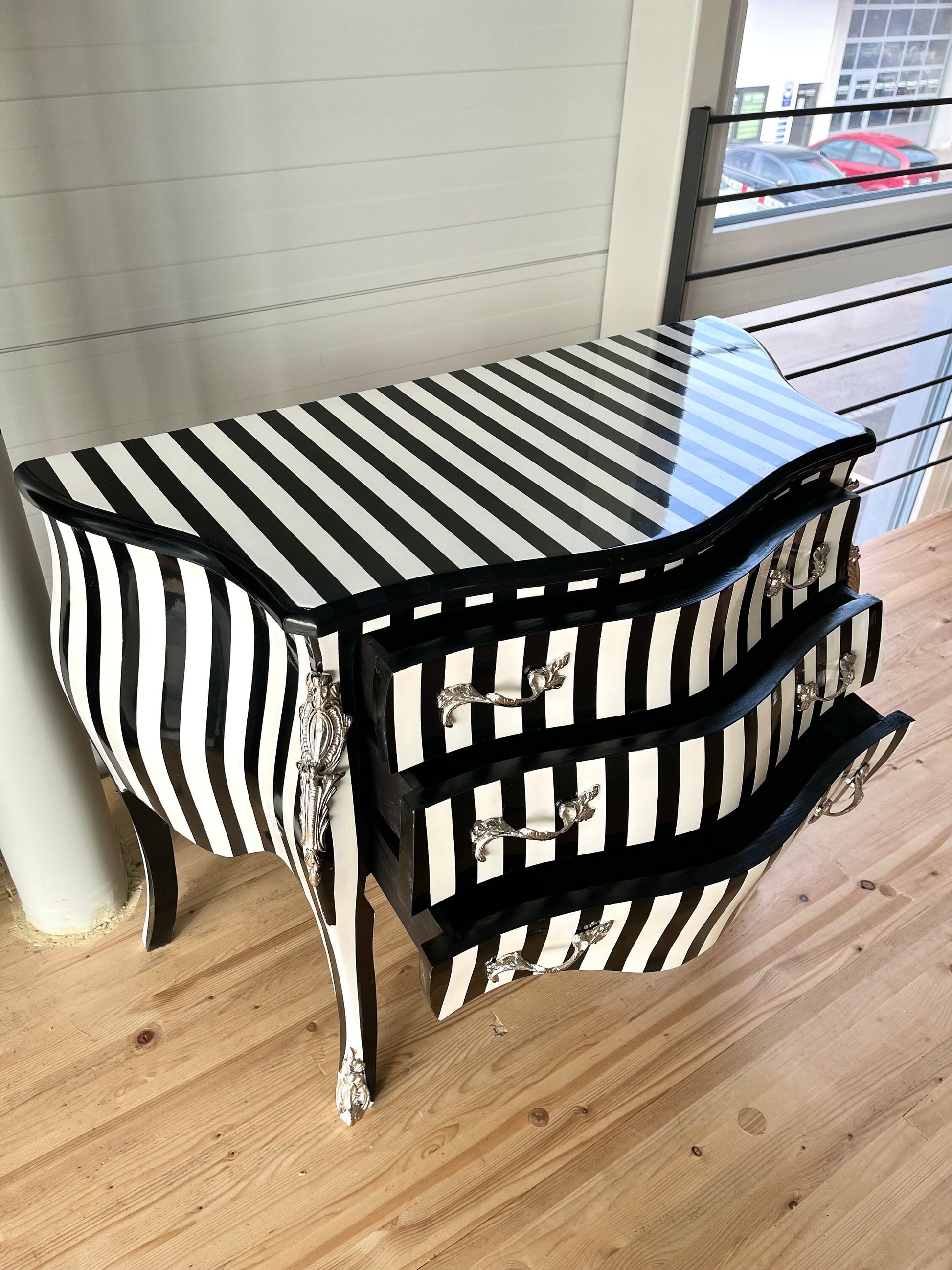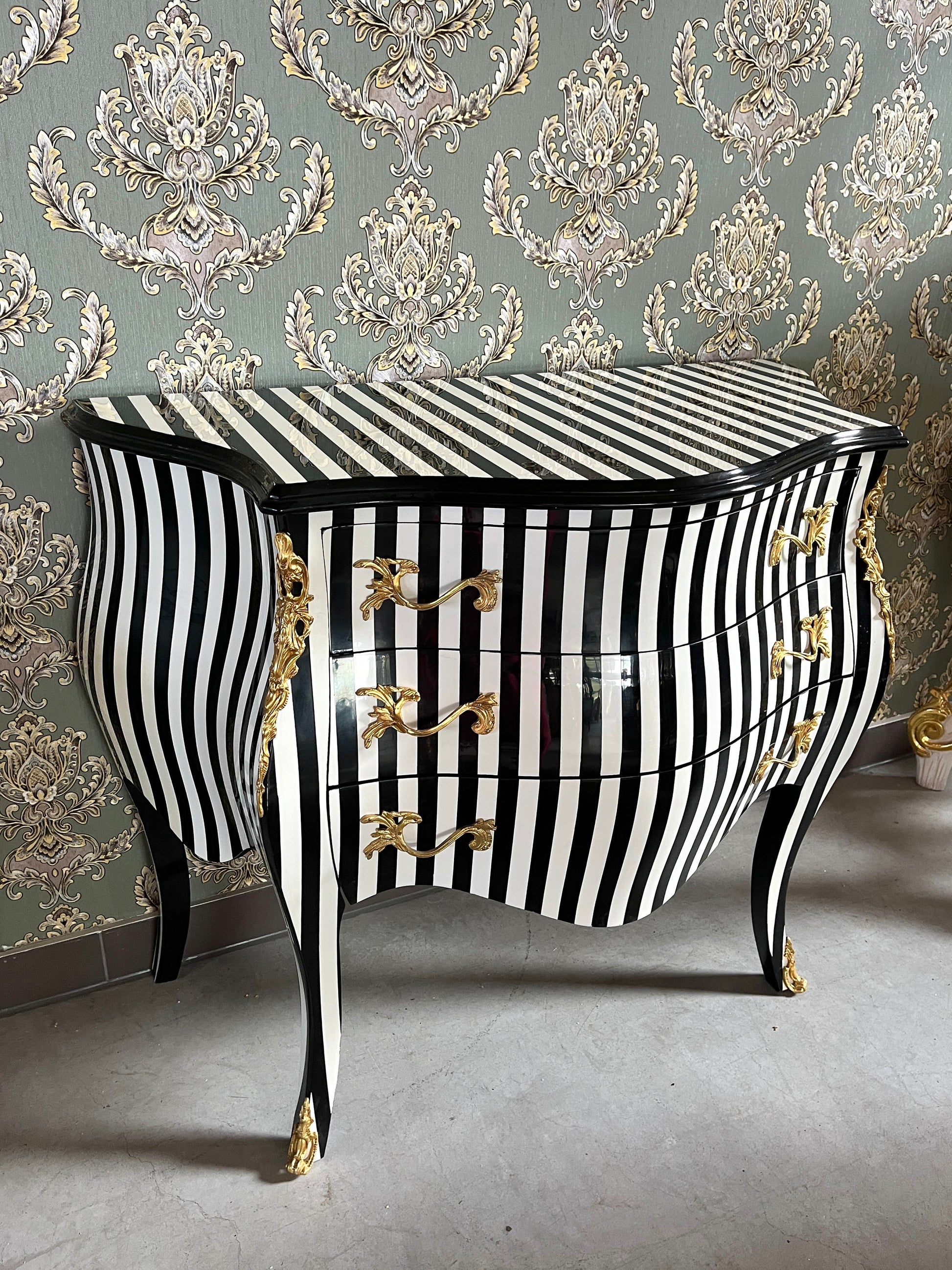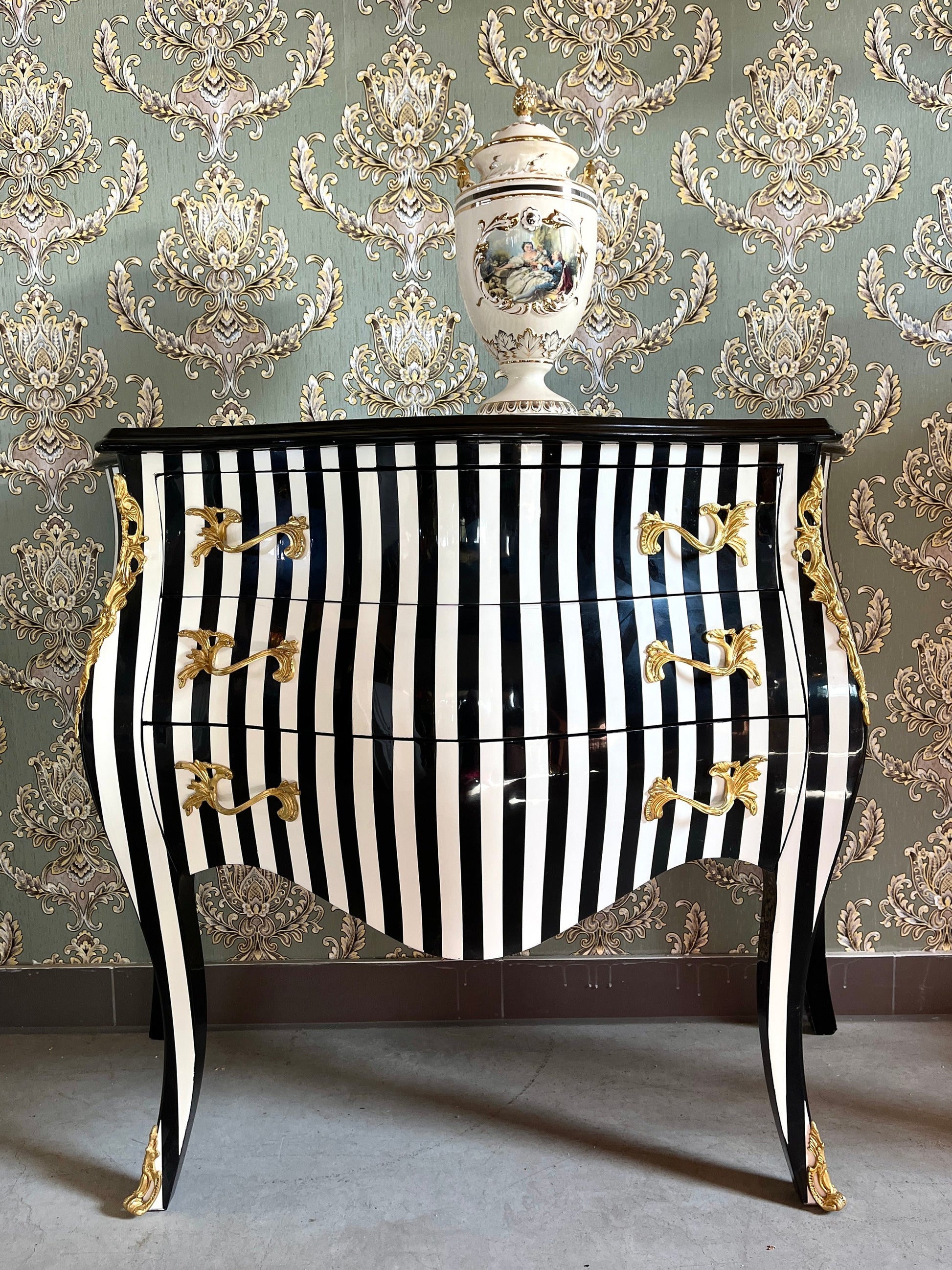 Deluxe wooden chest of drawer in black stripe. This classic style is from French Louis XVI reproduction with bronze handles and inlaid with 3 drawers.
