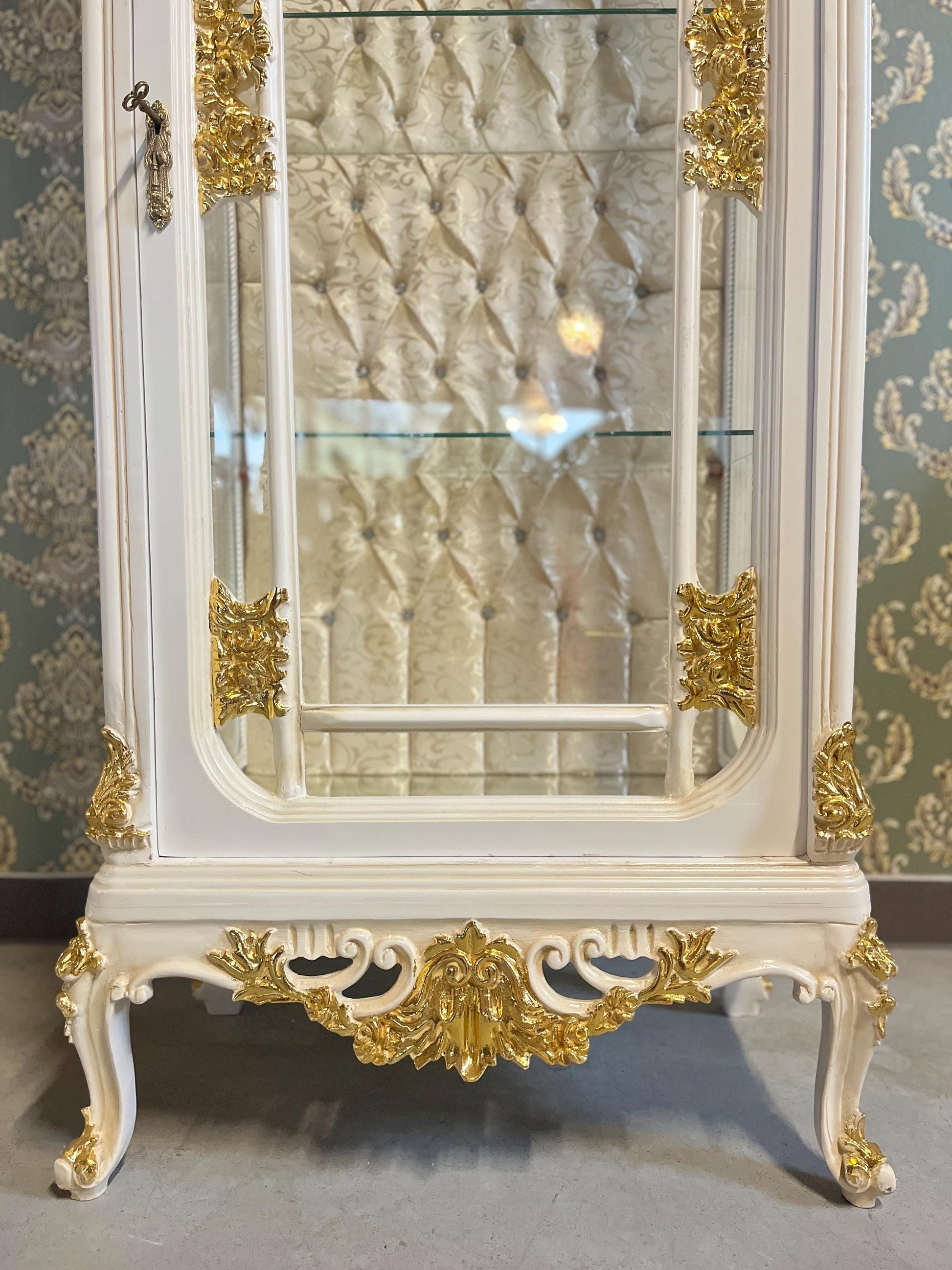 Display Cabinet Retro Baroque Style Showcase in Wooden White Color Gold Leaf Decorated Glass Cabinet in Dining Room Furniture